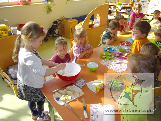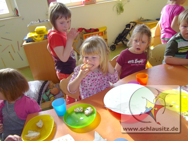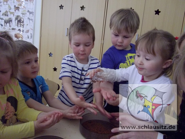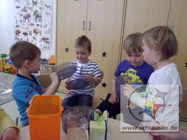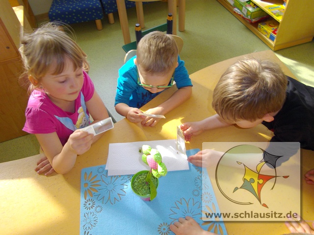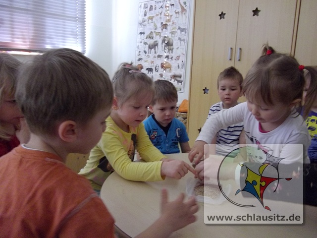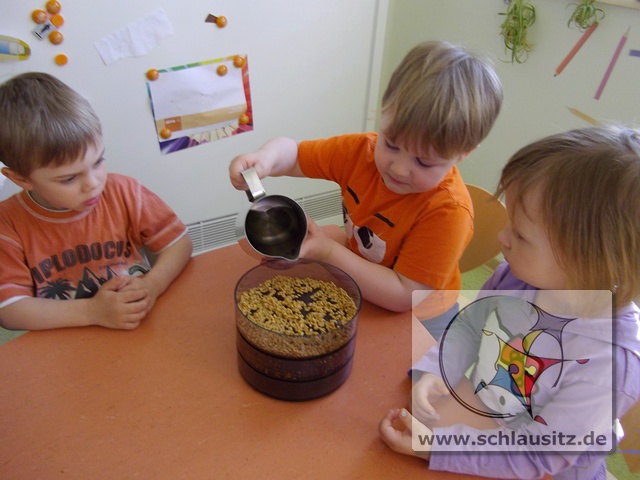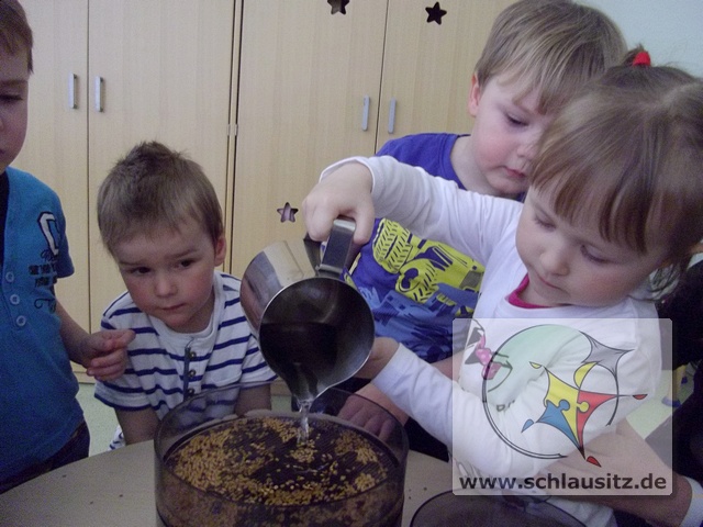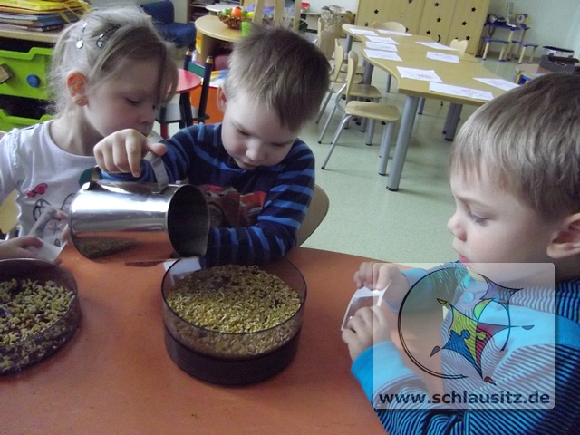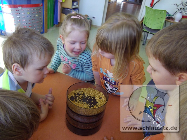 Was sind Sprossen, wie entstehen sie und was kann man mit ihnen machen? Fragen über Fragen, welche uns Helenas Mama beantworten wollte. Sie brachte uns verschiedenste Samen mit in den Kindergarten und erklärte uns, das Sprossen kleine Keimlinge sind, viele Vitamine und Mineralstoffe enthalten und kinderleicht zu ziehen sind. Und das wollten wir ausprobieren.Dafür bestückten wir die einzelnen Etagen eines Keimapparates mit Radieschen-, Klee-, und Kressesamen. Anschließend gossen wir unsere Saat tüchtig. Für den ersten Tag waren damit alle Arbeiten erledigt. Der Keimapparat erhielt nun einen sonnigen Platz auf dem Fensterbrett. An den folgenden Tagen mussten wir unsere angehenden Sprossen wässern und lüften und natürlich beobachten.Schon am zweiten Tag waren klitzekleine grüne Hälmchen zu erkennen. Um das Wachstum genauer verfolgen zu können, nahmen wir Lupen zum Vergrößern zur Hand. Der 5.Tag war dann unser Erntetag. Da der Ertrag reichlich ausfallen würde, luden wir die Schlaumäuse zum gemeinsamen Frühstück ein. Sie bedankten sich und brachten frische Brötchen mit, die sie zuvor beim Bäcker gekauft hatten.