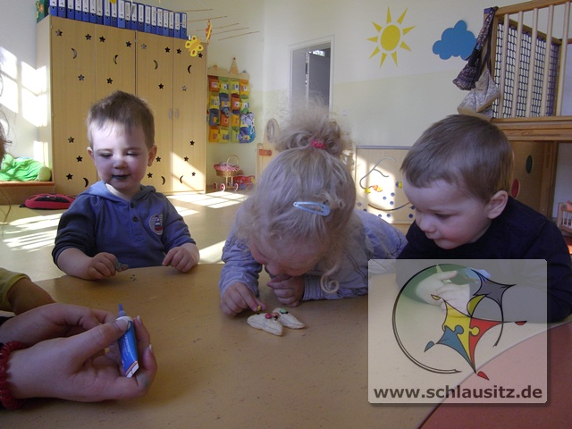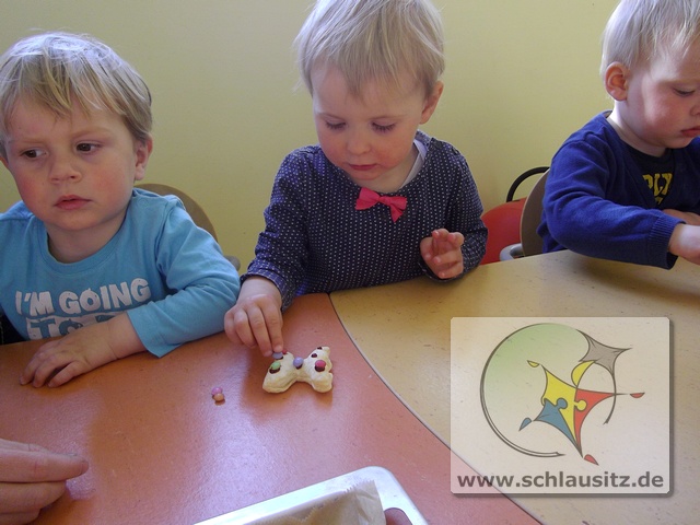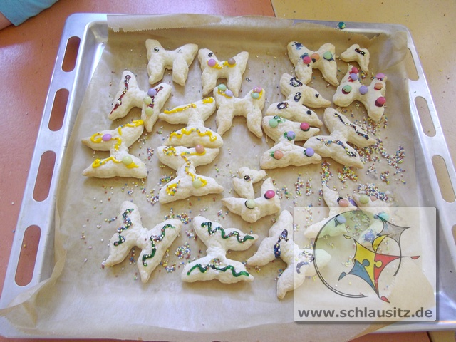 Doch alle Kinder schafften es, ein Tierchen auf das Backblech zu legen. Nach dem backen und auskühlen wurden die kleinen Schmetterlinge noch mit bunter Zuckerschrift und leckeren Smarties verziert.