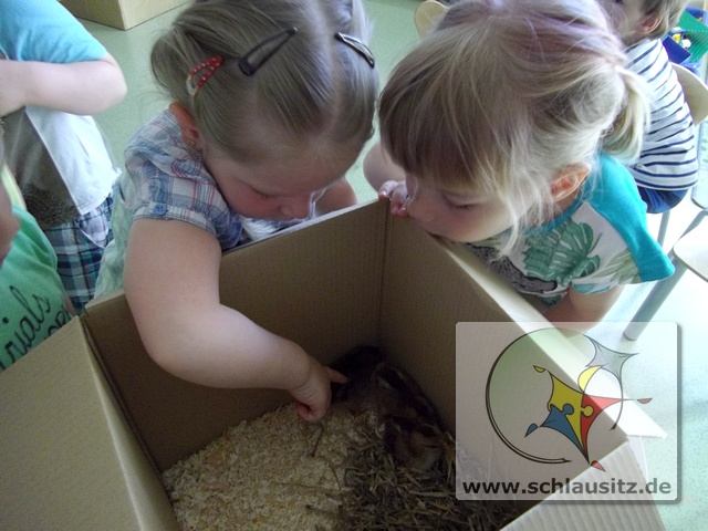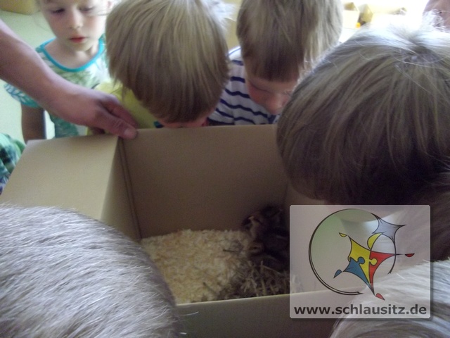 Mit einem lauten „Tschiepen“ begrüßten uns die drei Winzlinge. Die Mama, ein Zwerghuhn, war mit zwei weiteren Küken zu Hause geblieben. Nun konnte jedes Kind die kuschligen Tiere streicheln.
