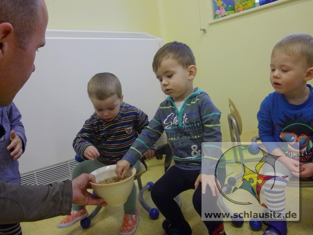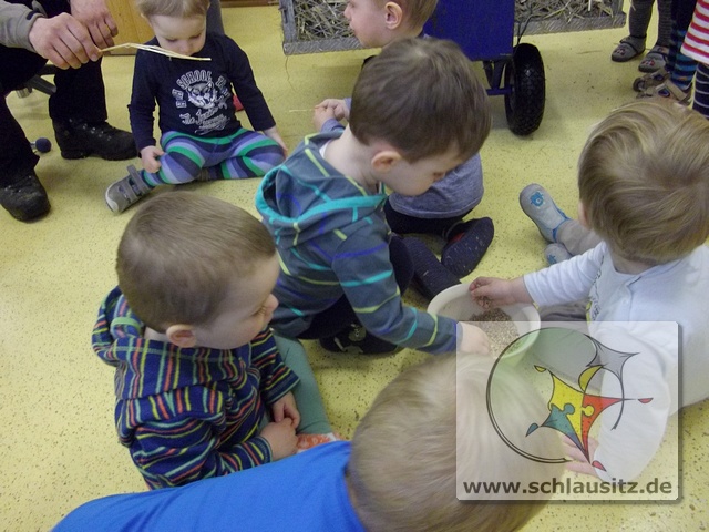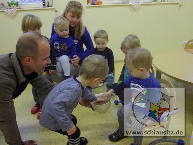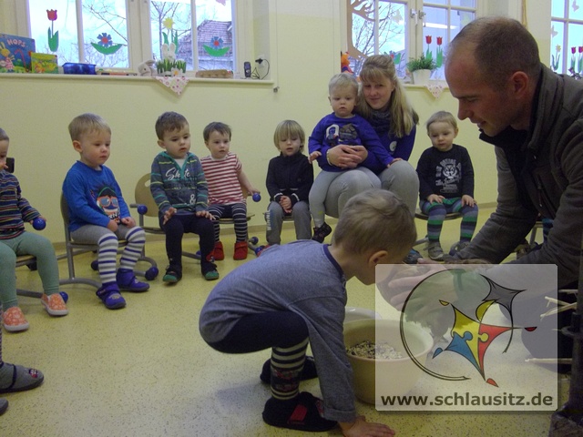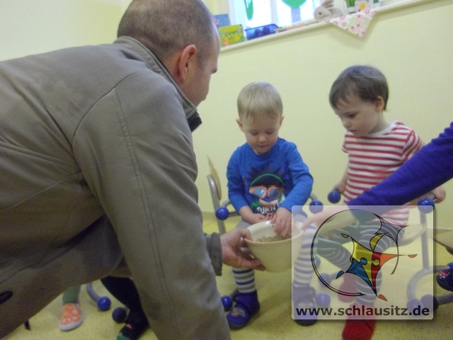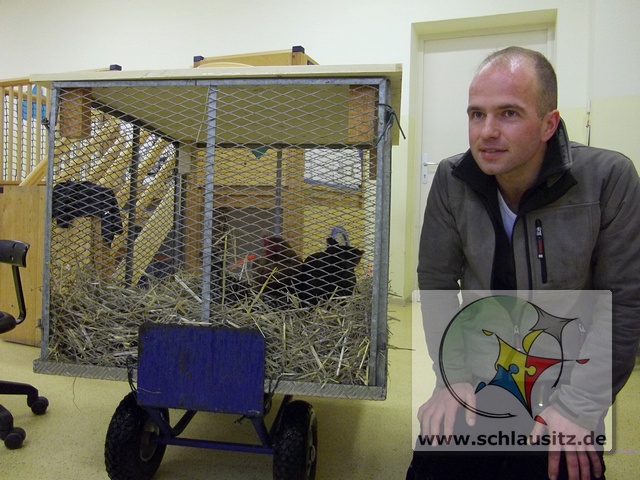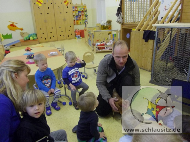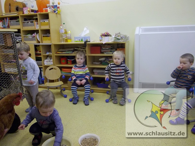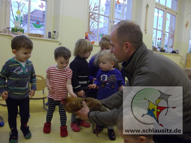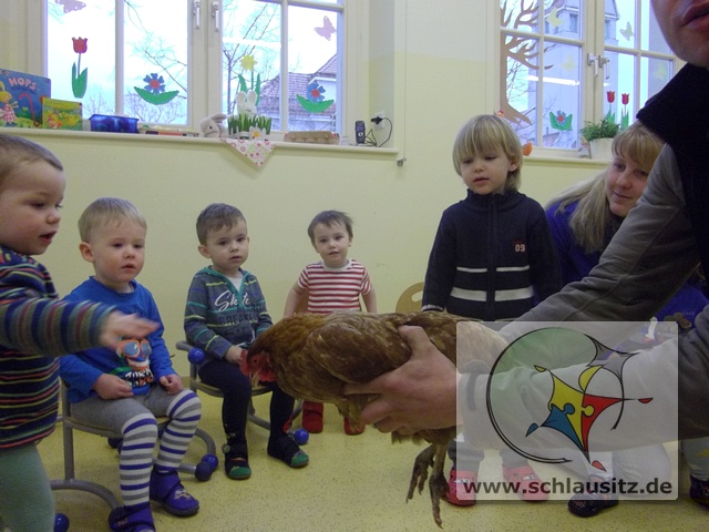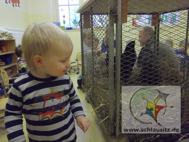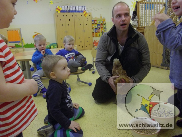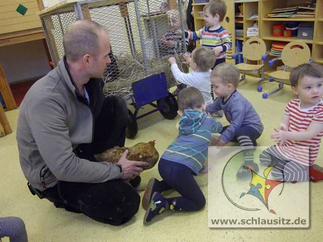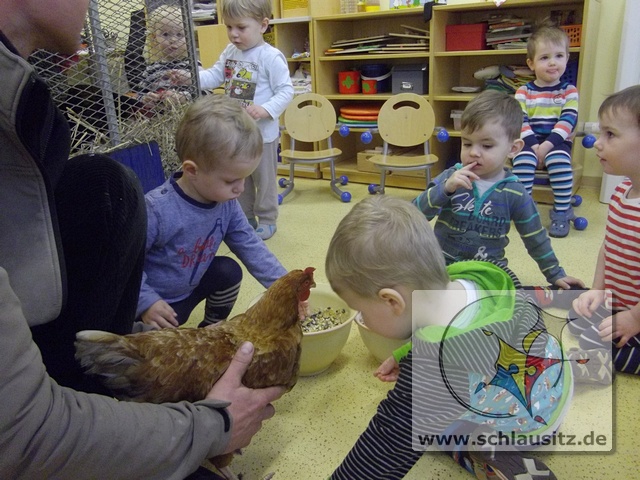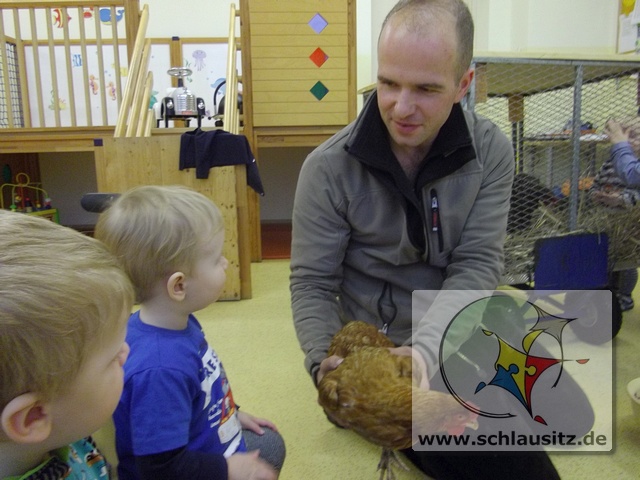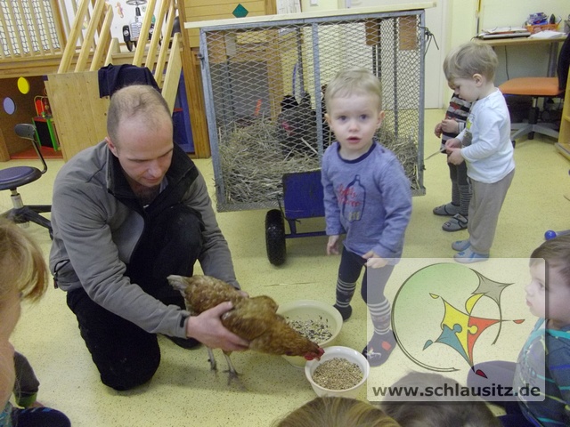 Großes Gegacker herrschte heut bei den Jüngsten. Herr John überraschte die Kinder mit einem Käfig voller Hühner.