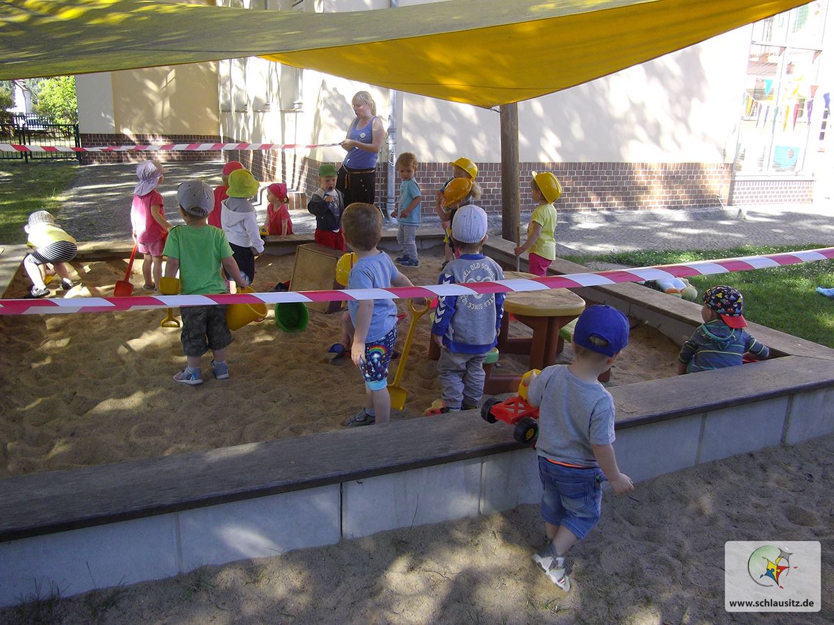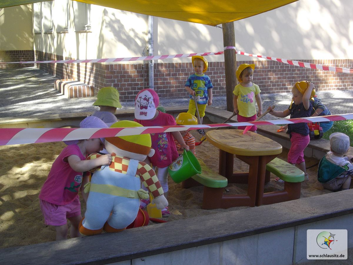 Das Absperrband um unseren Sandkasten wurde gespannt und so konnte die „ Arbeit“ auf unserer Baustelle losgehen.
