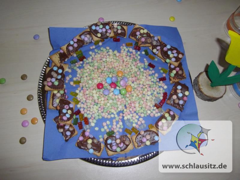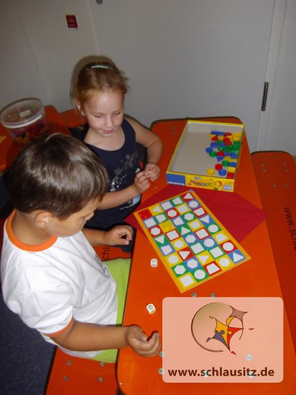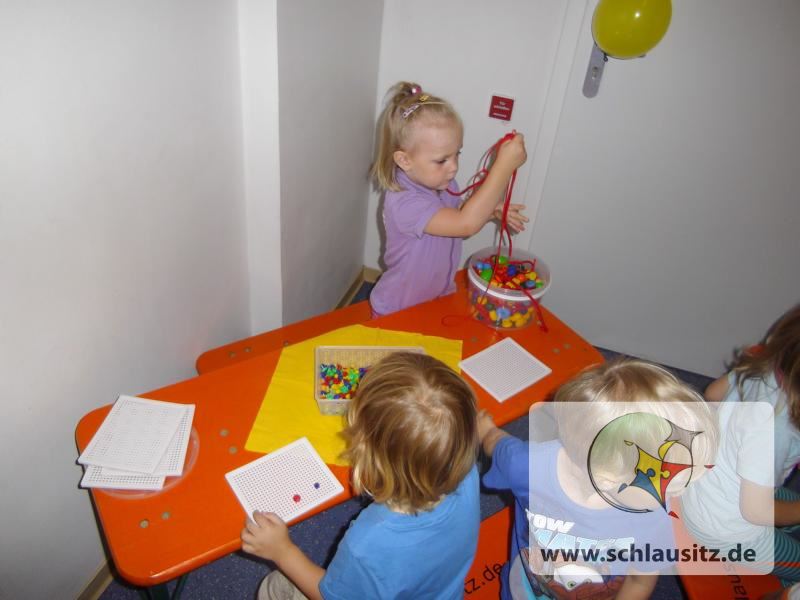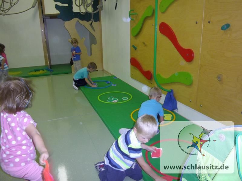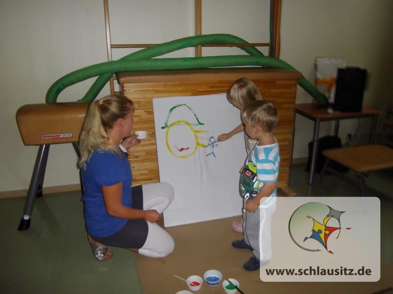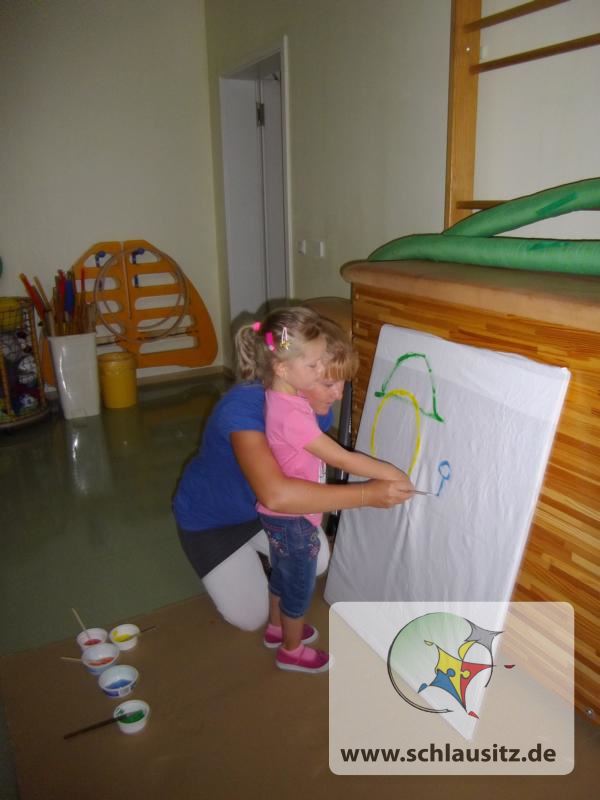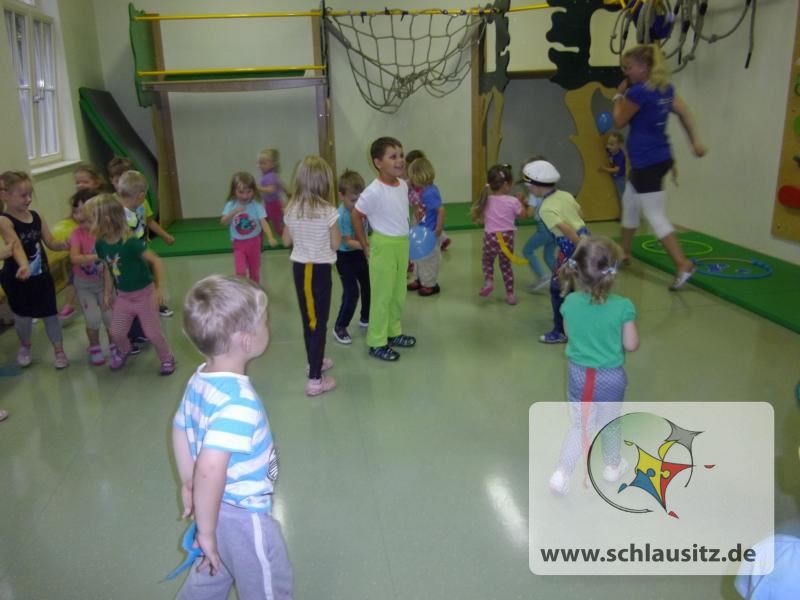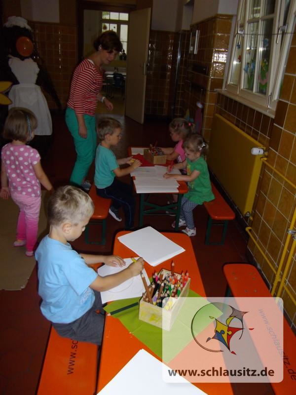 Lustige Musik ließ gar keine schlechte Laune über den verregneten Tag aufkommen. Bei einigen Farbspielen zeigten die Kinder ihr Geschick. Zwischendurch stärkten sich alle Maler mit farbigen Keksen und eingefärbtem Zauberwasser. Beim abschließenden Fangespiel gab es sogar eine Siegerin, unsere Nele. Sie konnte ein Malhaus als Preis mit nach Hause nehmen.
