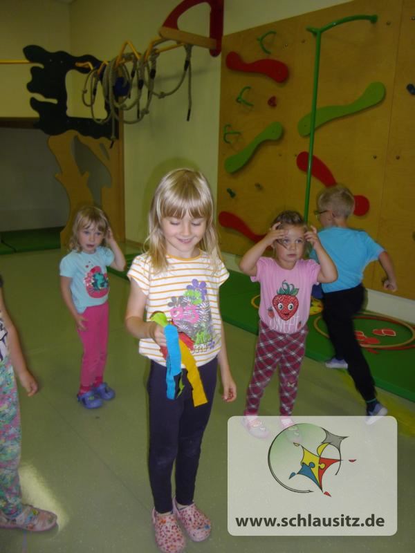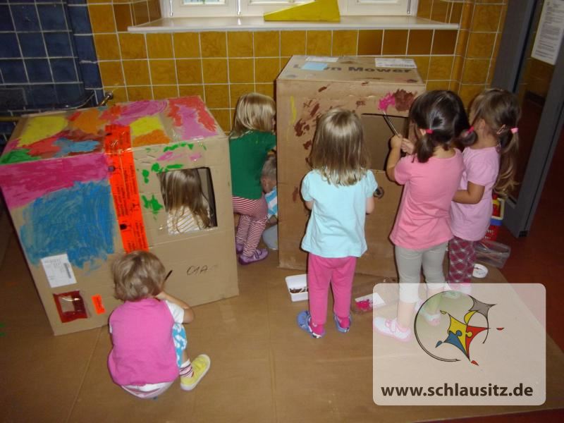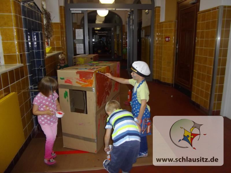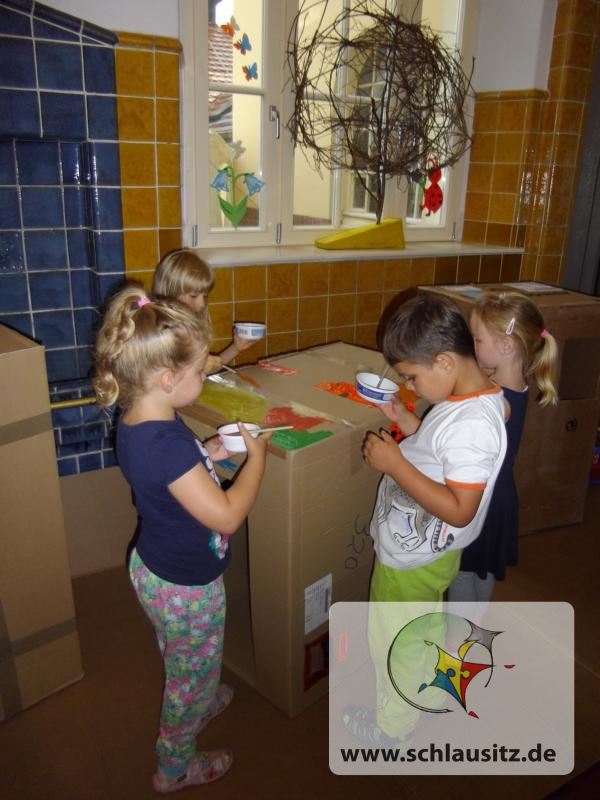 Als echte kleine Malersleute haben wir nur kurz überlegt und unser Fest einfach nach drinnen verlegt. Zuerst wurde eine Sonne auf eine große Leinwand gemalt. Auch die großen bunten Kartonhäuser konnten wir anstreichen. Im Sportraum tanzten wir mit bunten Tüchern und Luftballons.