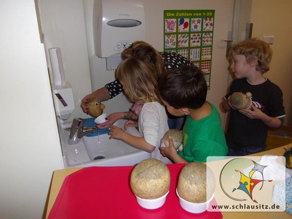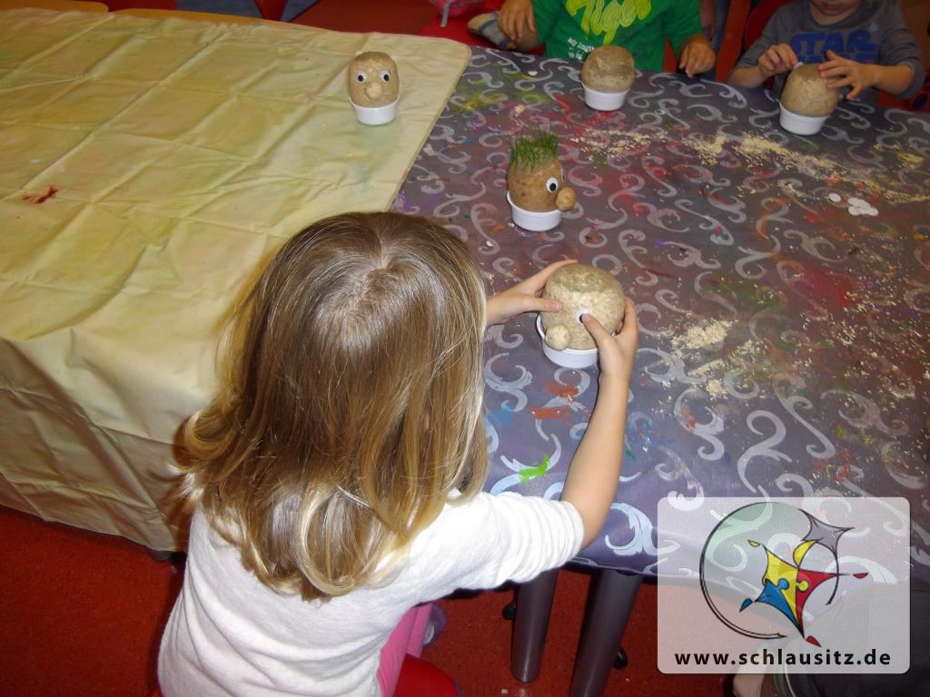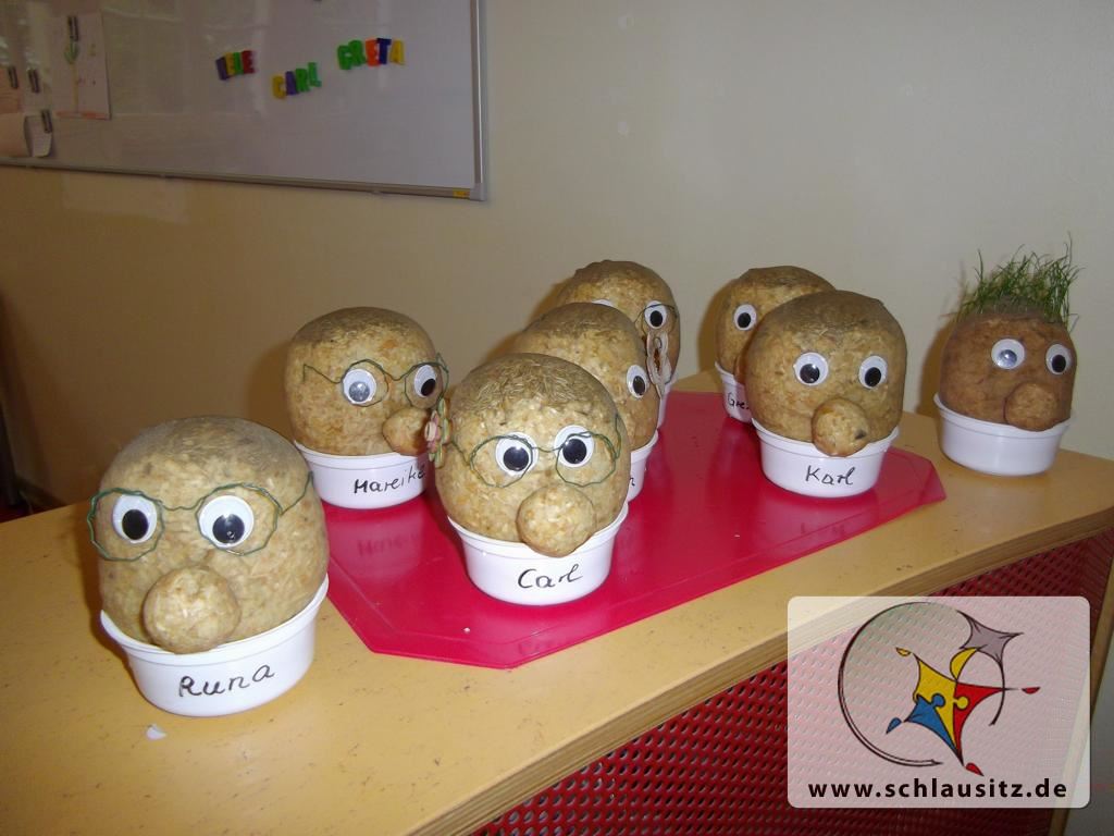 Jetzt kam die Nase dran, dabei half Frau Hafemann und so bekam unser „Kartoffelmann“ langsam ein Gesicht. Natürlich gehören zum Gesicht auch Augen, dabei half Runa und zeigte uns, wie man sie anbringt. Doch wo bleiben die Haare? Die werden bald wachsen, erklärte Frau Hafemann. Wir müssen den Kopf immer feucht halten und ihn regelmäßig gießen. Unsere „Kartoffelköpfe“ hielten wir vorsichtig unter den Wasserhahn. Mareike stellte fest, dass er jetzt viel schwerer ist, weil die Holzspäne alle nass sind. Nun sitzen unsere Kartoffelköpfe auf der Fensterbank und wir beobachten gespannt, wann die ersten Haare sprießen.