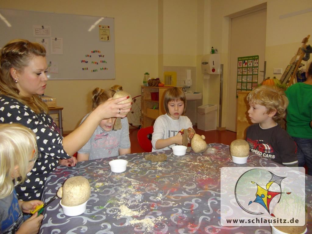 Heute besuchte uns Runa`s Mama und brachte eine kleine lustige Gestalt mit. Neugierig betrachteten wir sie und fragten: „ Ist das eine Kartoffel?“ Runa`s Mama lächelte und erklärte: „Das Männchen hab ich selbst gemacht!“ Natürlich wollten wir auch so ein Männchen basteln. Frau Hafemann hatte schon alles vorbereitet und das benötigte Material mitgebracht. Zuerst nahmen wir einen feinen Strumpf und füllten ein Löffel Grassamen hinein. Danach brauchten wir viele Hobelspäne und füllten damit den Strumpf zu einer festen, großen Kugel.
