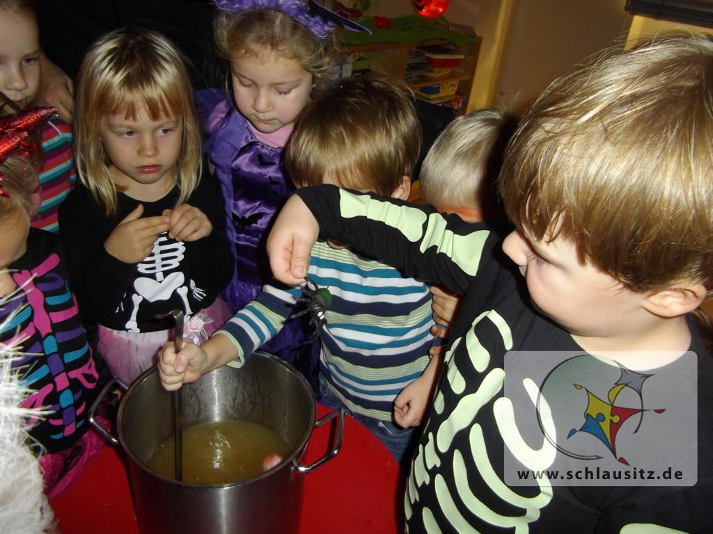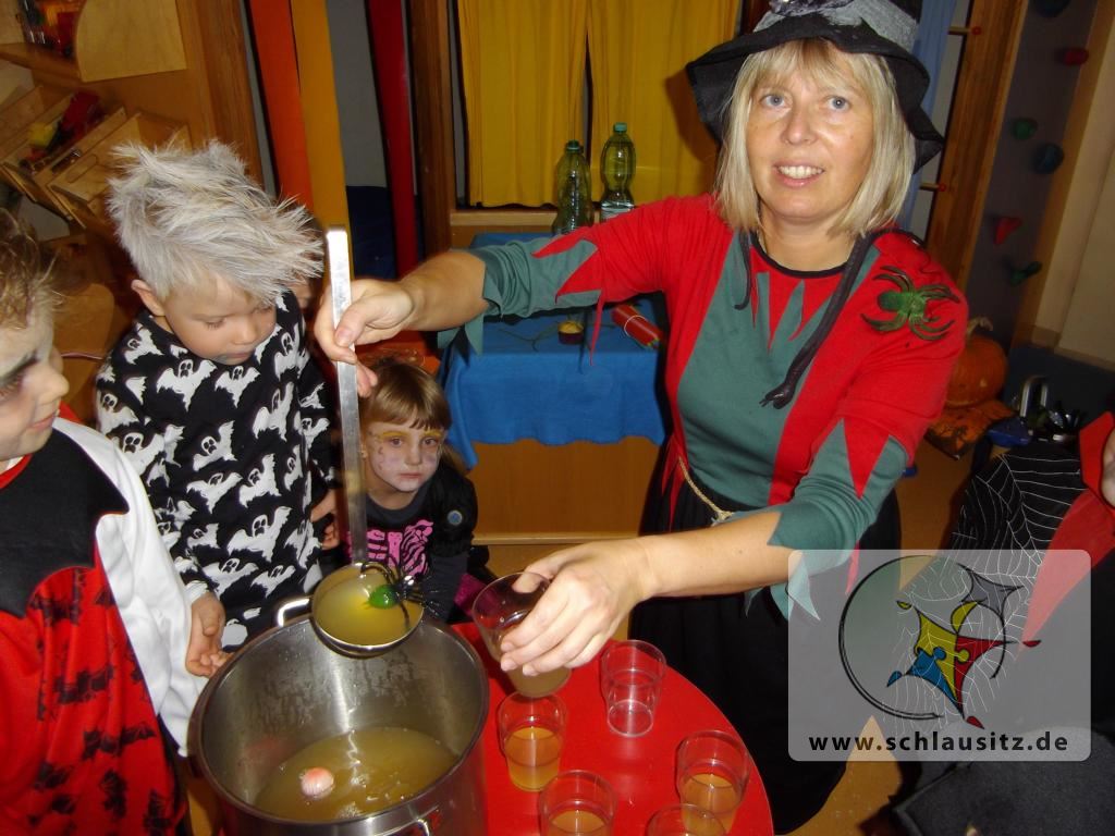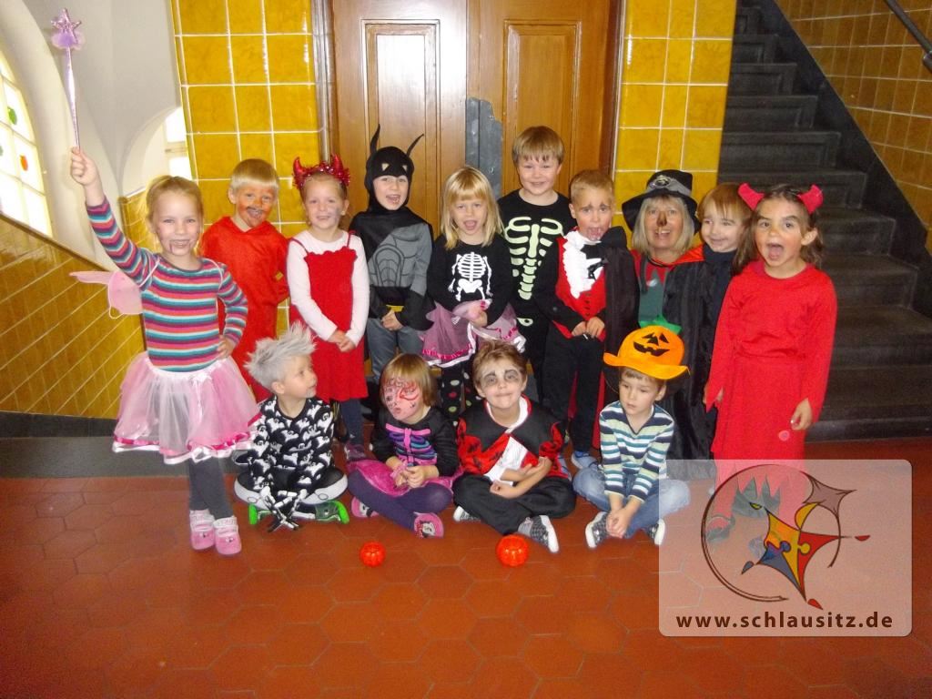 Gemeinsam mit den Grashüpfern feierten wir Schlaumäuse eine schaurig-schöne Halloweenparty. Schon am Tag zuvor haben wir gruselig verzierte Muffins gebacken und unsere Kürbisse ausgehöhlt. Zu unserer Party erschienen viele Vampire, Hexen, Skelette, Teufel, Spinnen und sogar Batman. Nach dem Eröffnungstanz zogen wir durch das ganze Haus. Jeder, den wir trafen, musste eine Mutprobe bestehen und ekligen Krötenschleim mit Vampirblut trinken. Später, im Gruppenraum aßen wir unsere Muffins und tranken schleimige Glibberbowle. „Hm, köstlich!" Abschließend sahen wir uns den Film „Lauras Stern – Halloween" an und knabberten selbstgemachtes Popcorn. Viel zu schnell war dieses tolle Fest vorbei, doch nächstes Jahr treffen wir uns wieder!