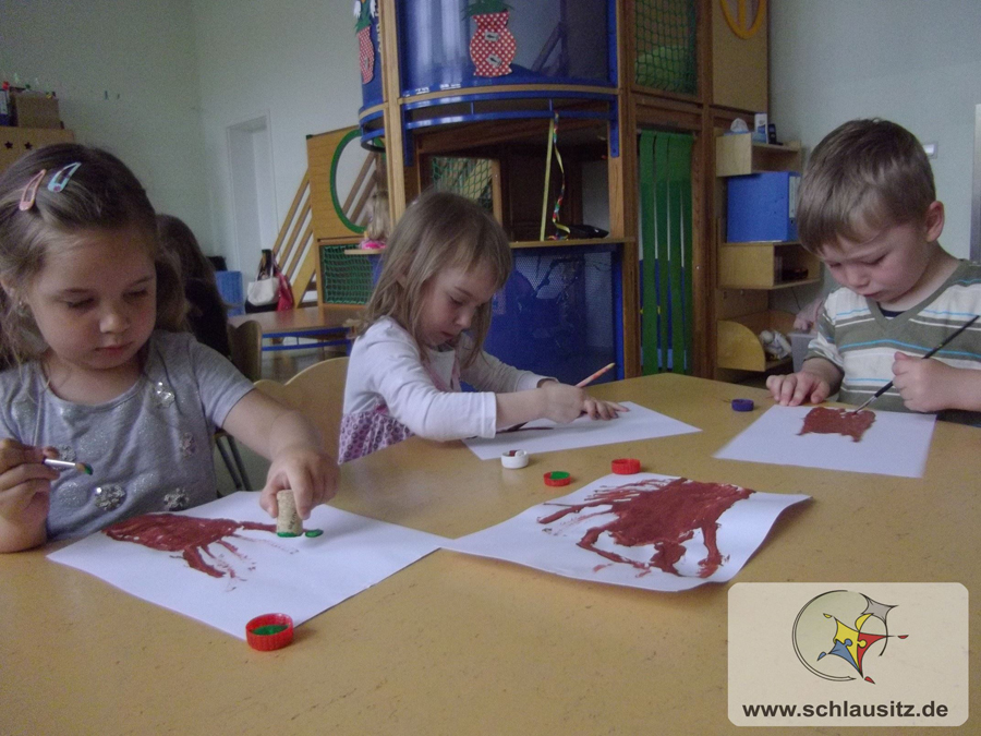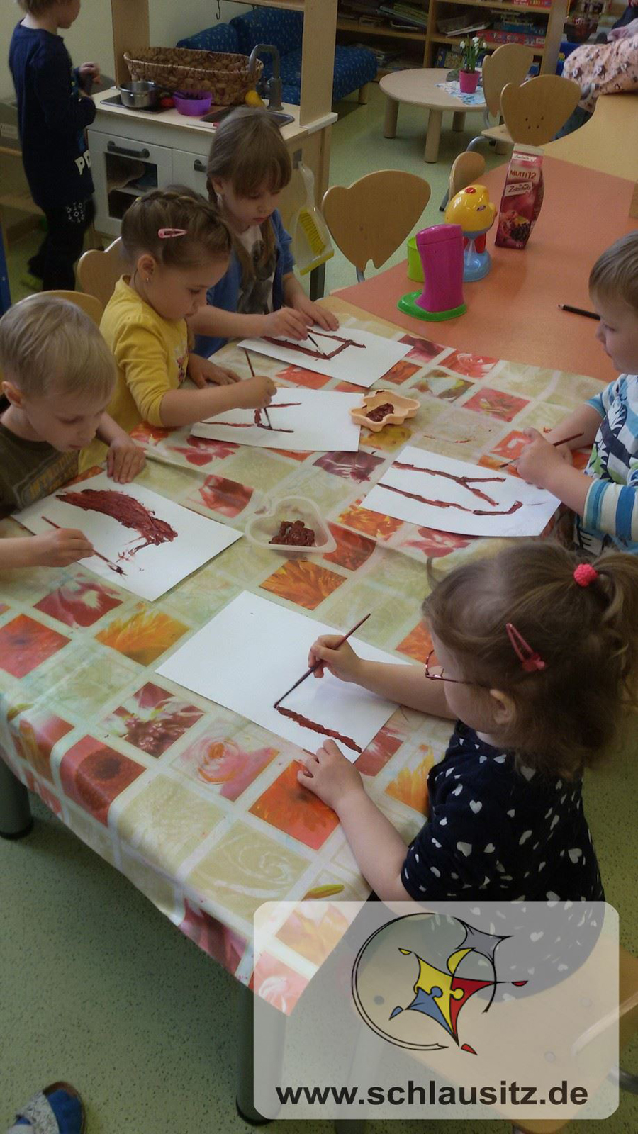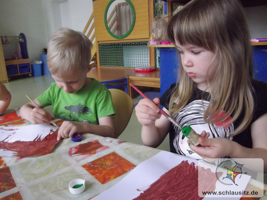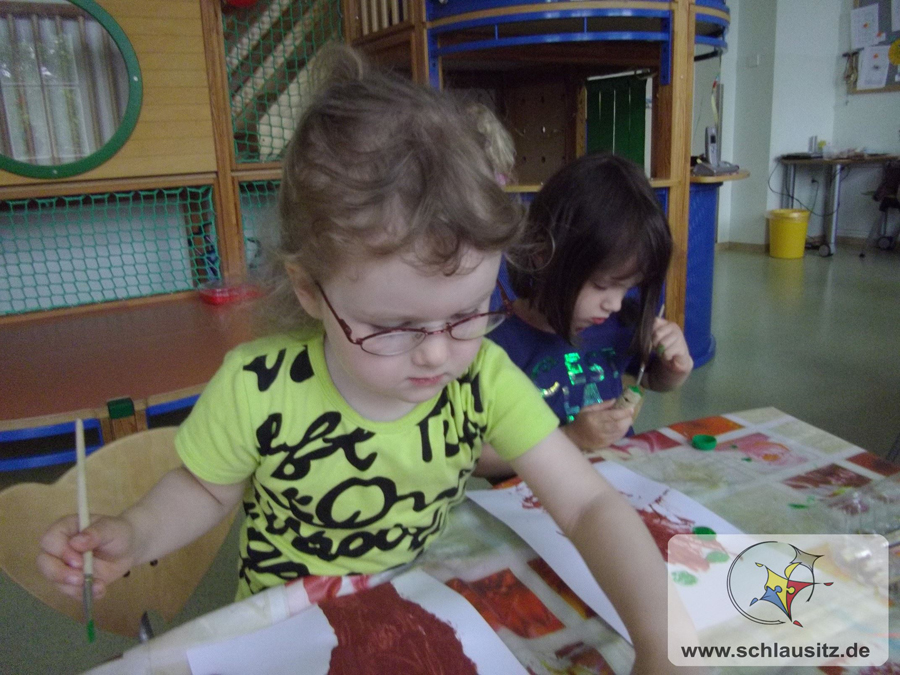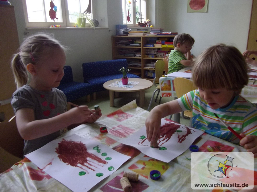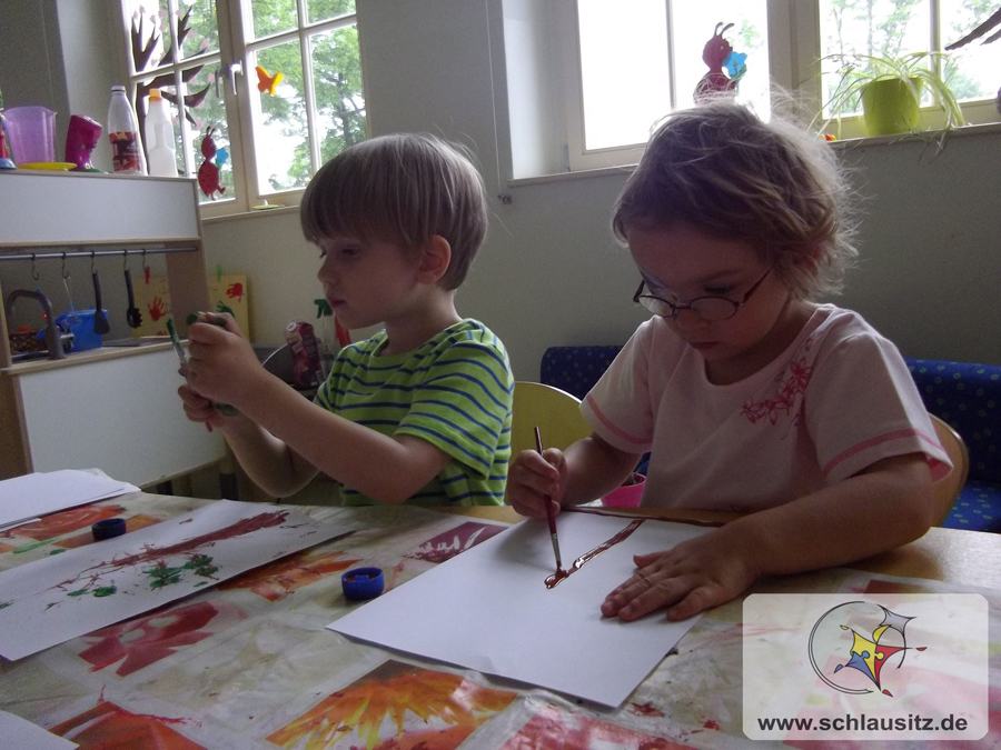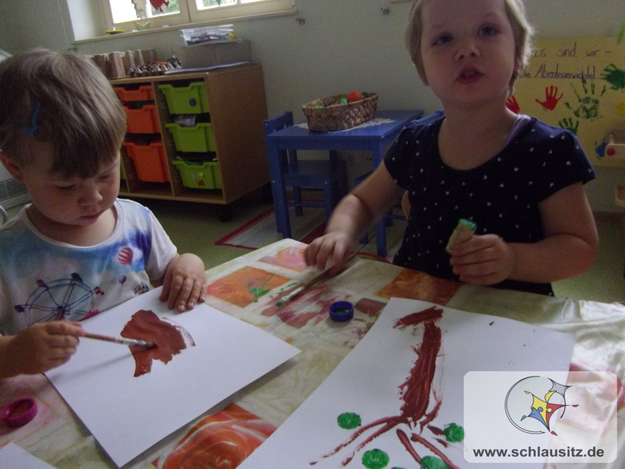 Der Baum ist „Freund der Kinder“. Nicht nur, weil Bäume Kinder magisch anziehen und zum Klettern einladen. Schon beim Gestalten des „Vogelbaumes“ haben unsere Abenteuerwichtel interessante Dinge über den Baum und seine „kleinen Gäste“ erfahren. Endlich ist es soweit, die Blätter an den Bäumen haben eine „saftig“ grüne Farbe angenommen. Diese werden uns in der warmen Jahreszeit reichlich Schatten spenden. Im Morgenkreis und im Tagesablauf haben die Kinder den Baum mit seinen feinen Blättern und die Struktur seiner Äste und Rinde näher „erforscht“. Danach haben die Abenteuerwichtel ihre „Entdeckungen“ mit Pinsel und Farbe aufs Papier gebracht. Ganz viele einzigartige Bäume sind dabei entstanden. Sicher wird das nicht die letzte Begegnung der Kinder mit ihrem „Freund“ dem Baum gewesen sein, denn zu verschiedenen Jahreszeiten lädt er zum neuen Entdecken ein.