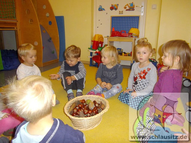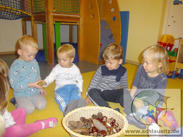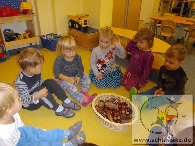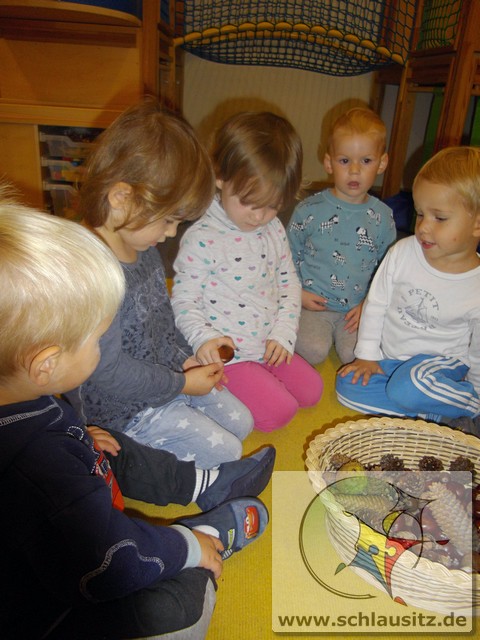 Mats hat uns einen großen Korb voll Herbstfrüchte mitgebracht. Im Morgenkreis benennen wir alle Früchte und jedes Kind kann fühlen, wie sich die einzelnen Früchte anfühlen.