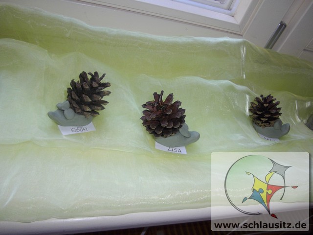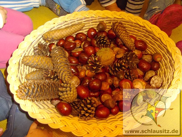 Wir haben z. B. Kastanien, Eicheln, Zapfen und Eichelhütchen entdeckt.