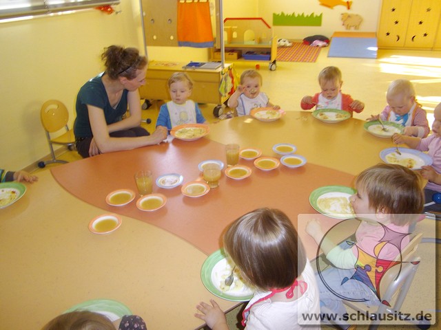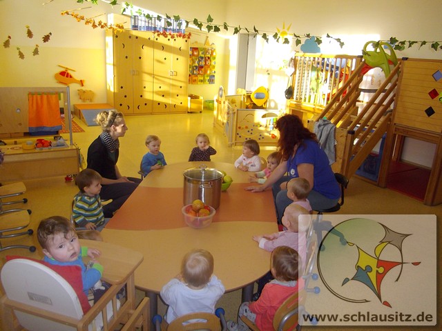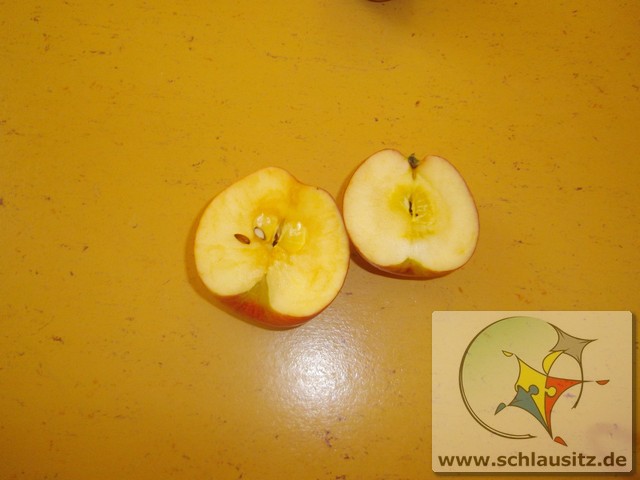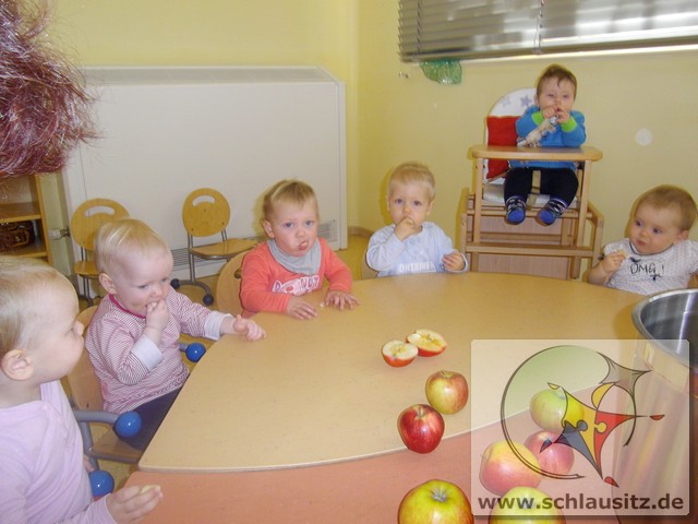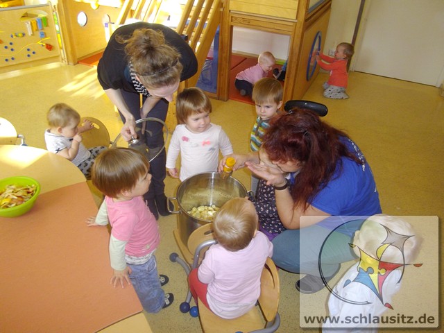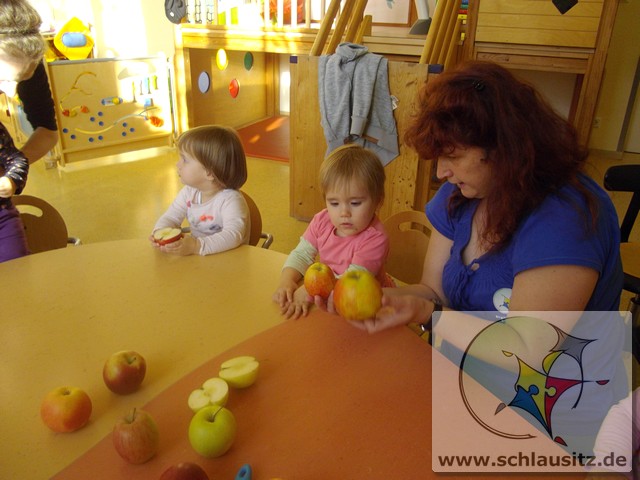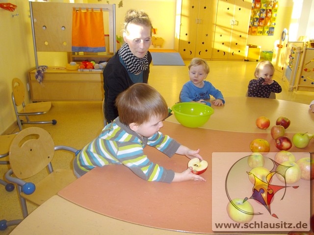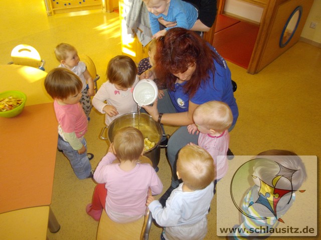 Image00006Ende Oktober besuchte uns Frau Bergmann und half uns beim Kochen von Apfelmus. Zuerst betrachteten wir die Äpfel, erkannten große und kleine, gelbe, rote und sogar grüne. Frau Bergmann schnitt einen Apfel auf und wir entdeckten die kleinen schwarzen Kerne. Eddie nahm sich gleich eine Apfelhälfte und bis herzhaft hinein. Nun half uns Frau Bergmann alle Äpfel zu schälen und kleinzuschneiden. Natürlich durften wir alle auch naschen. Später gaben wir noch etwas Wasser und Zimt dazu. Dann wurden die Äpfel gekocht und wir gingen in den Garten spielen. Frau Bergmann pürierte anschließend die Äpfel und zum Mittagessen aßen wir unseren Apfelmus. Hmmm, das war lecker!