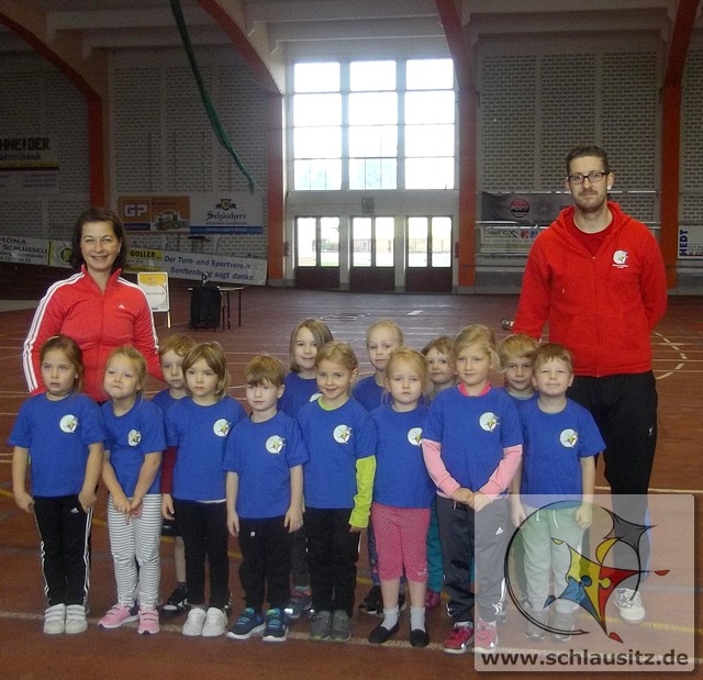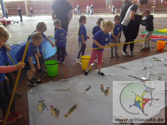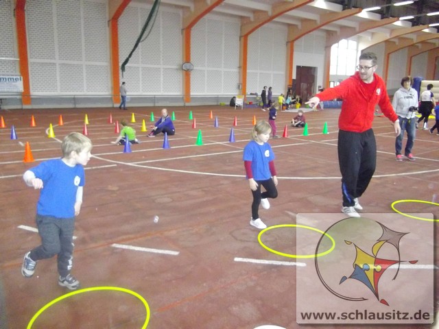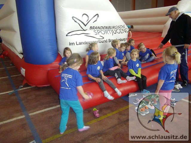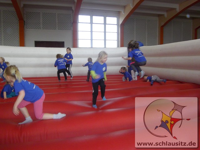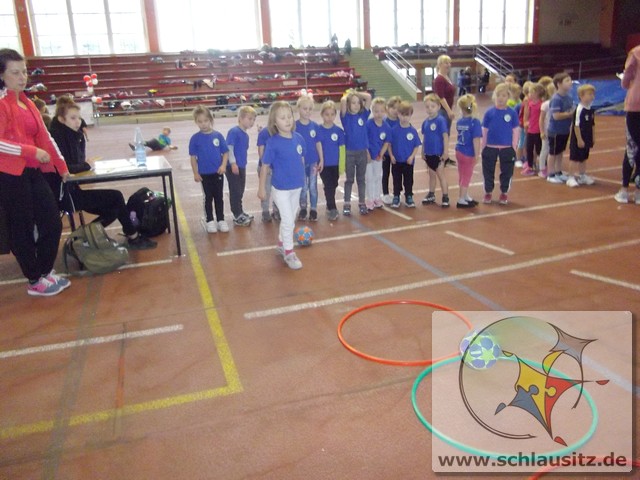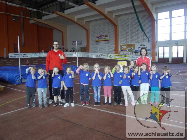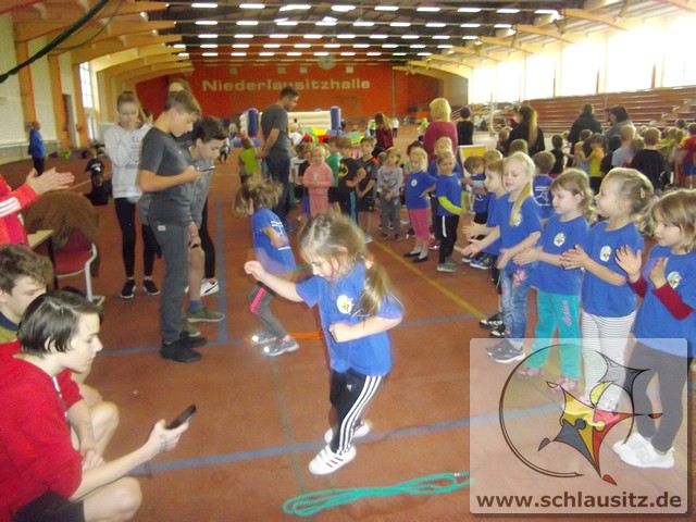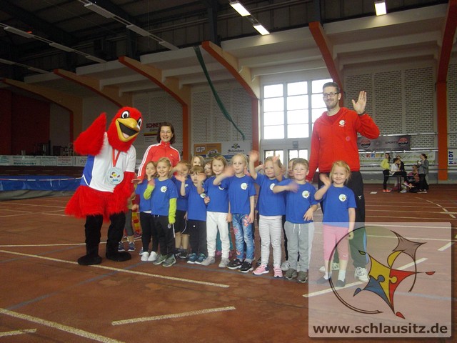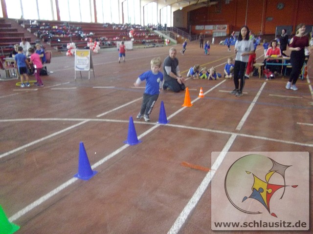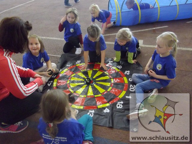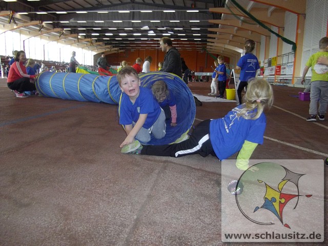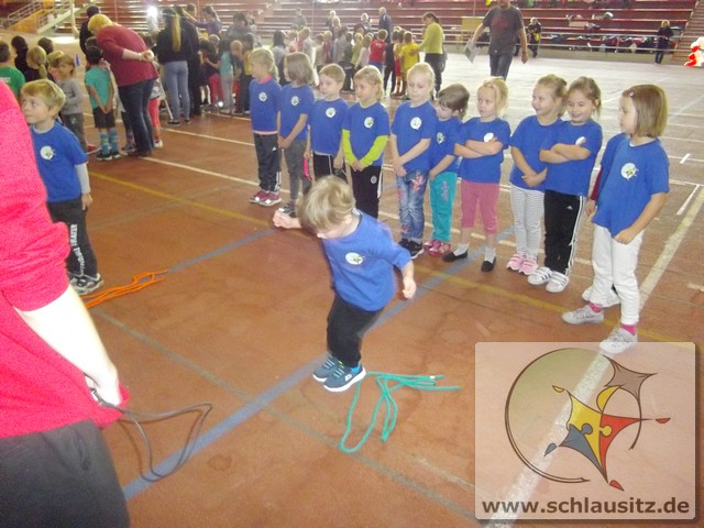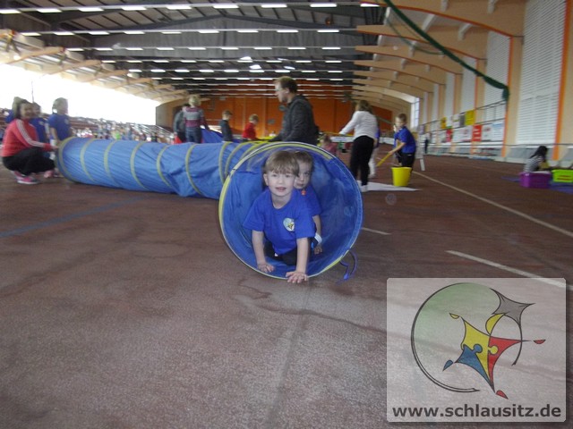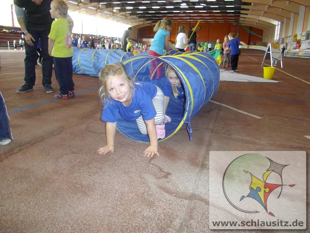 Am Dienstag, den 15.11.2017 nahmen wir das erste Mal an der Kitaolympiade teil. Die gut organisierte Veranstaltung fand in der Niederlausitzhalle Senftenberg statt. 14 Sportler/innen aus unserer Einrichtung zeigten, was in ihnen steckt. Ob Slalom laufen, seitlich über ein Seil springen, einen Ball in den Ring werfen oder mit einem Bein in den Ring springen, alle Übungen wurden meisterlich ausgeführt und die Kinder powerten sich richtig aus. Zwischendurch kam noch Fritzi, das Maskottchen der Olympiade, vorbei. Die Kinder waren hellauf begeistert, dass Fritzi auch zum Anfassen vor Ort war. Nachdem die letzten Übungen absolviert waren, konnten sich die Kinder noch auf der Hüpfburg austoben und einige Geschicklichkeitsspiele absolvieren. Zum Abschluss der Kitaolympiade wurden alle Kinder mit einer Medaille ausgezeichnet. Die Erzieher/innen waren sehr stolz auf die Kinder und nächstes Jahr wollen wir dann mit noch mehr Kindern an der Kitaolympiade teilnehmen. Ein Dankeschön gilt der Familie Morawa-Scholz für die tolle Unterstützung.