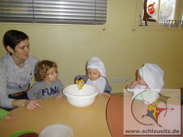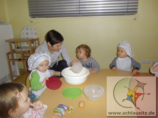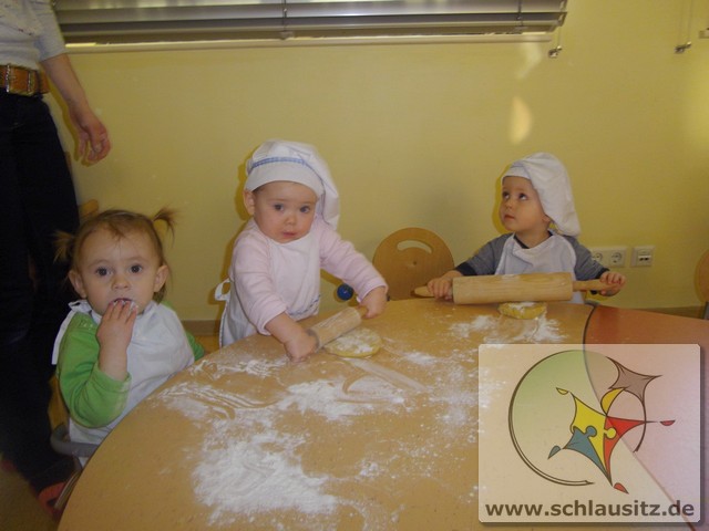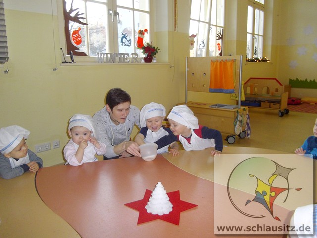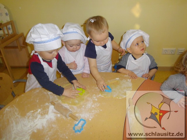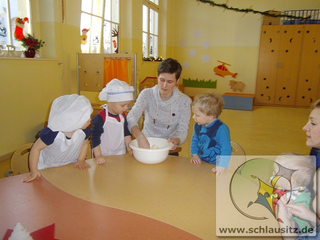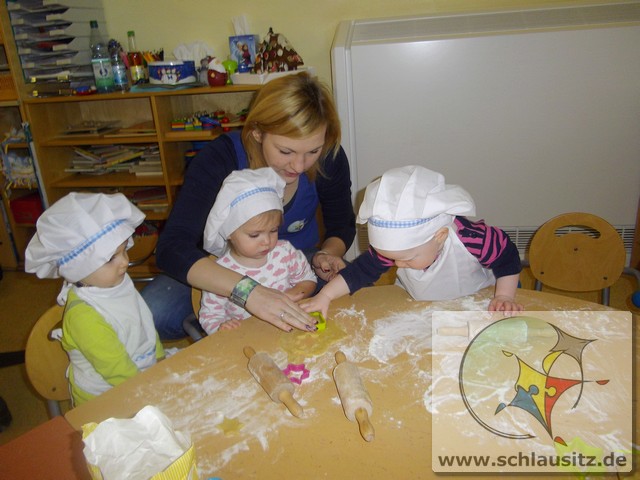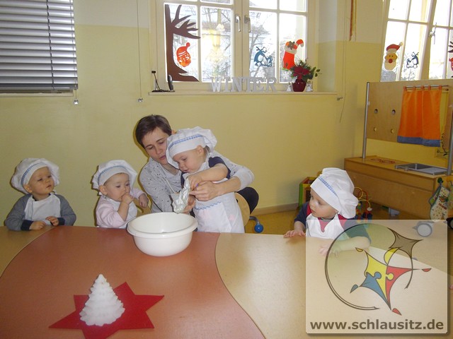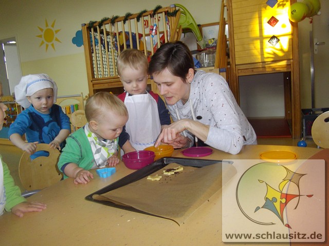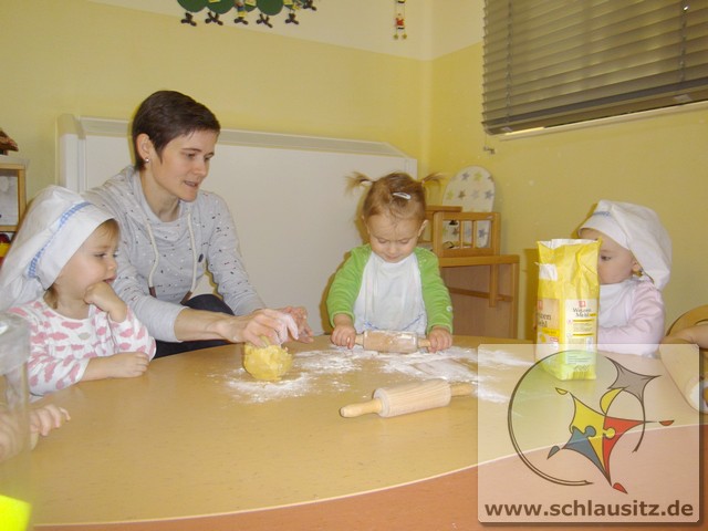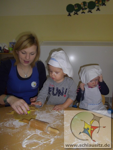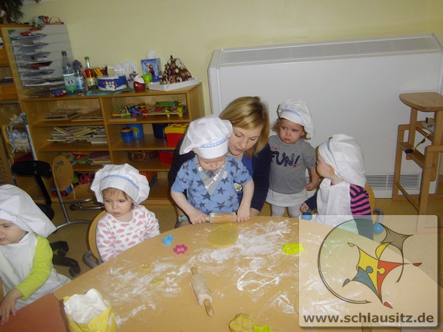 Am 19.12.2017 besuchte uns Eddie mit seiner Mama und gemeinsam backten wir köstliche Weihnachtsplätzchen. Frau Steuer hatte den Teig schon vorbereitet und so konnten wir gleich beginnen. Sie gab etwas Mehl auf den Tisch und rollte den Teig mit dem Nudelholz aus. Auch die kleinen Glühwürmchen bekamen kleine Nudelhölzer und konnten sich ausprobieren. Später stachen wir gemeinsam viele Weihnachtsmotive aus und legten sie auf das Backblech. Anschließend verzierten wir sie mit bunten und schokoladigen Streuseln und schoben die Bleche in den Ofen. Schon bald zog ein köstlicher Duft durch unser Haus. Natürlich durften wir auch alle mal naschen. Hmmm, einfach lecker!!!