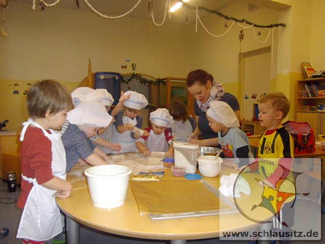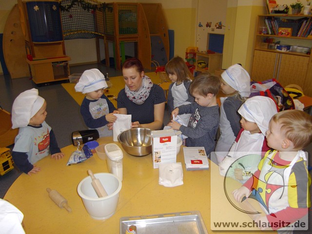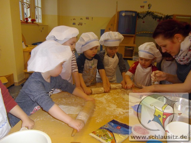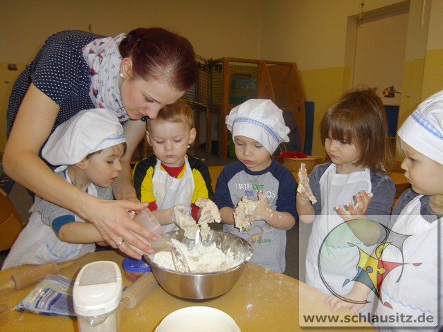 Schürze um, Mütze auf und los ging es. Wir stellten einen Teig her, was wirklich schwierig ist, weil dieser so an den Fingern klebt.