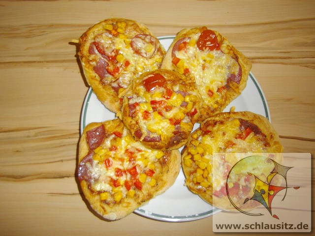 Teig, Salami, Paprika, Mais, Tomaten, Ketchup und Käse.