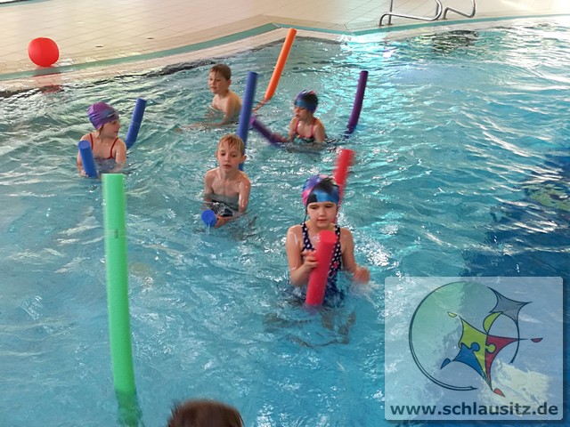 Zum einen Badekappen, bei denen unsere Haare nicht mehr verfilzen. Desweiteren bunte Badenudeln für jeden von uns. So können wir sehr intensiv und trotzdem mit Freude üben. Außerdem erhielten wir auch drei Tauchringe, die wir sehr gut im Wasser erkennen können. Und für unsere „Schwimmerzieher“ gab es ein Anleitungsbuch für Schwimmanfänger.