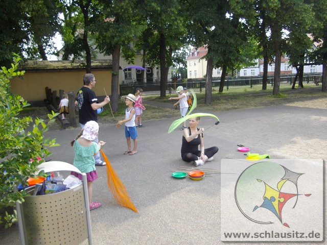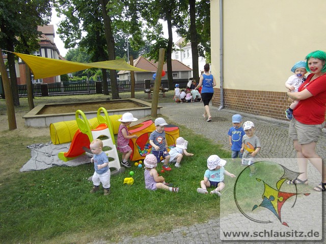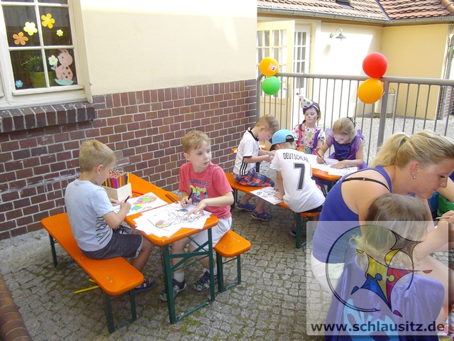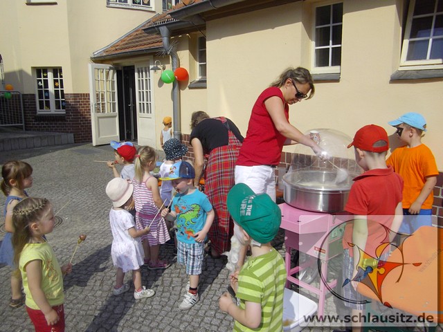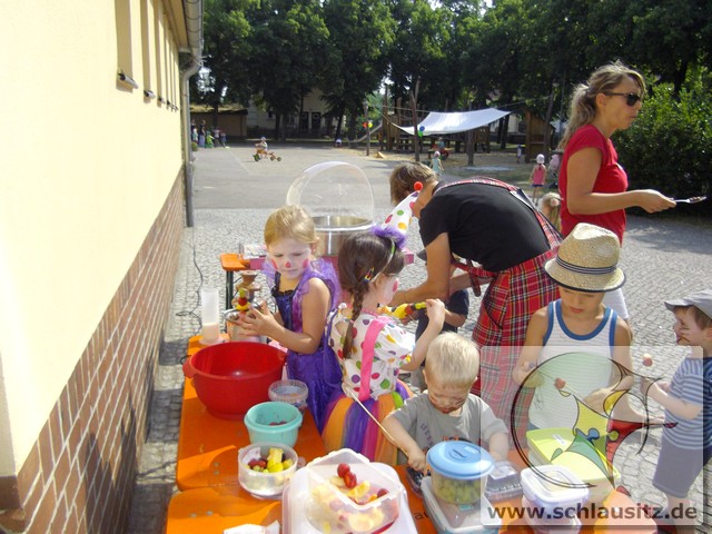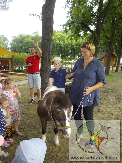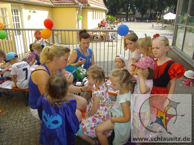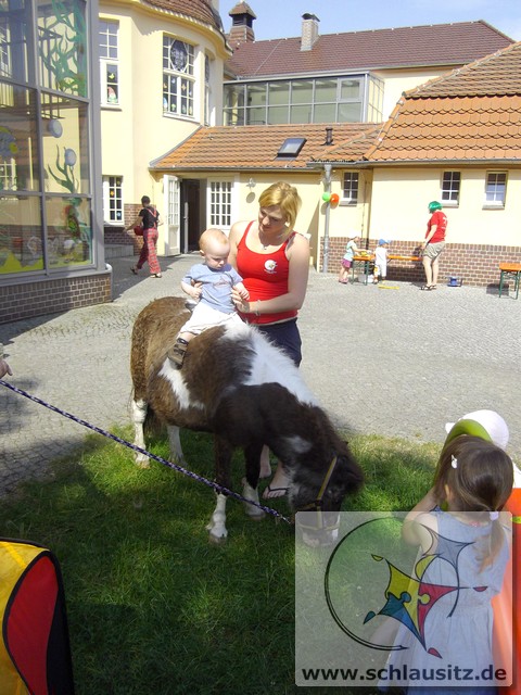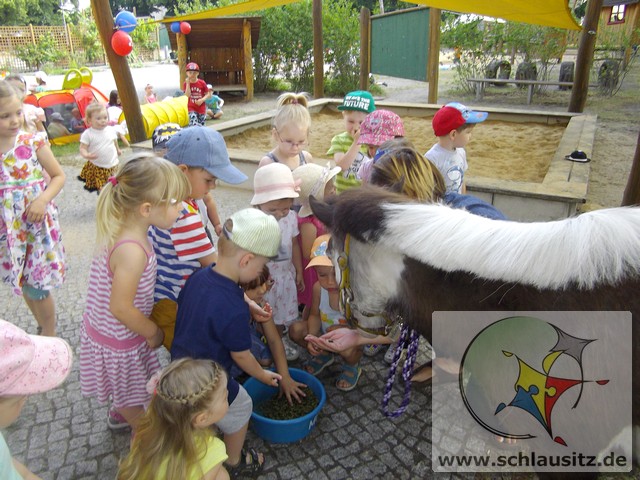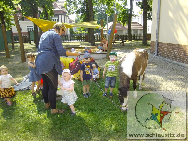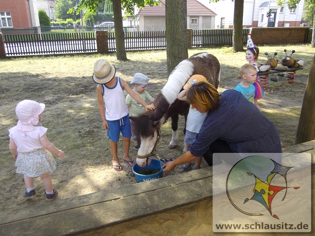 Ein großes Highlight war das kleine Pony „Gänseblümchen“! Nach einer kleinen Stärkung mit Pferdefutter durfte jedes Kind, welches ganz mutig war, auf Gänseblümchen reiten. Am Schminktisch konnten sich die Kinder nach eigenen Wünschen oder Motiven schminken lassen. Lecker waren natürlich die Zuckerwatte und das Obst am Schokobrunnen. Auch die Artisten von den Harlekids brachten uns kleine Kunststücke bei. Die Kleinsten hatten viel Spaß im Bällebad, im Kriechtunnel, auf der Rutsche und im Sandkasten.