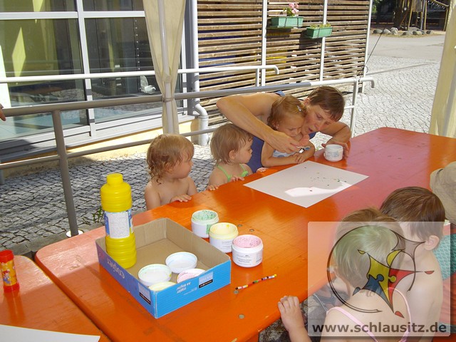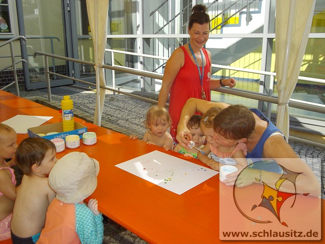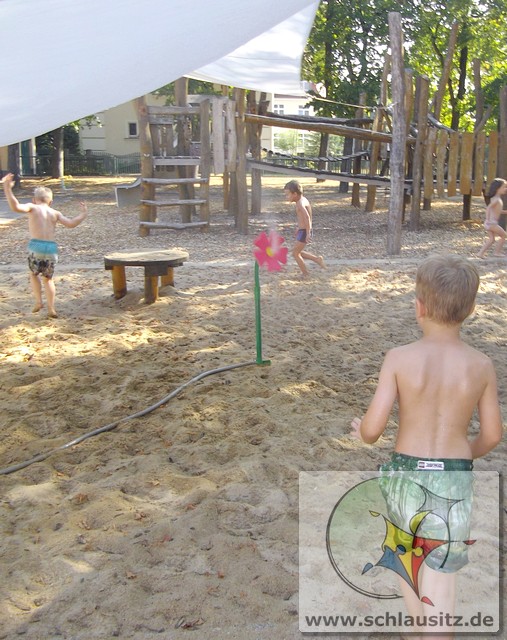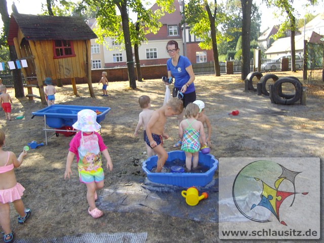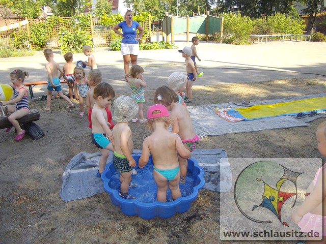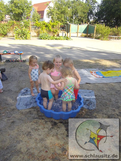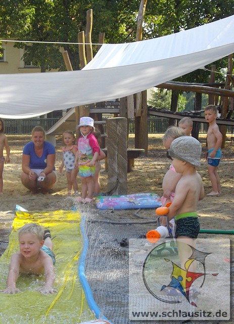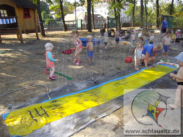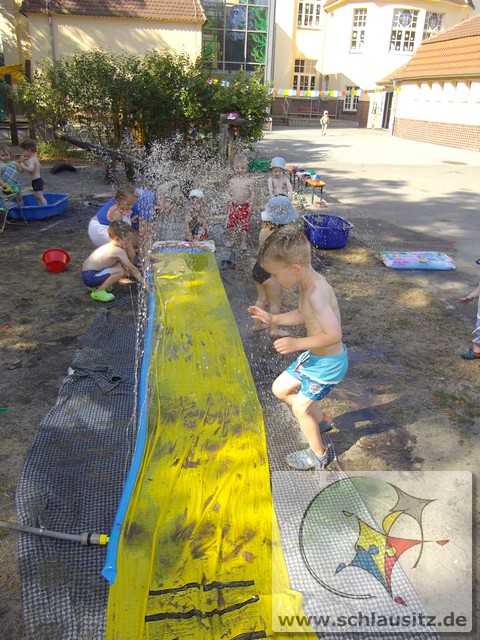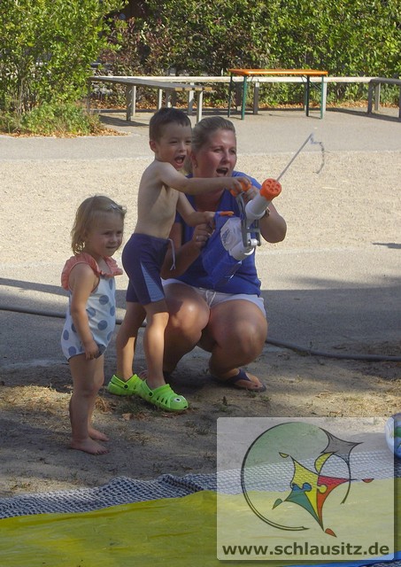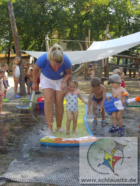 Bei den tollen Sommertemperaturen feierten wir am 01.08.2018 unser Wasserfest. Gut eingecremt und in Badekleidung kühlten wir uns alle unter der verrückten Blume ab. Beim Weitwerfen mit den Wasserballons konnte sich jedes Kind im Zweikampf ausprobieren. Natürlich durften die Seifenblasen nicht fehlen. Auch den Jüngsten machte die Jagd nach den schillernden Blasen riesige Freude. Großen Spaß bereitete allen Kindern die Wasserrutsche. Einfach Anlauf nehmen und durch das kühle Nass rutschen. Auch die Wasserspritzpistole kam voll zum Einsatz, dabei waren Tempo und Zielsicherheit gefragt. Man konnte sogar mit „Wasser“ basteln! Mit dem Seifenblasenspender konnten die Kinder ein individuelles Bild mit farbigem Seifenwasser pusten. Zu einem Wasserfest gehört natürlich auch Wassereis! Nach einer kurzen Erfrischung in der Muschel wartete schon selbstgemachtes Eis aus Himbeeren und Melone auf uns. Was für eine erfrischende Abwechslung und ein toller Spaß!