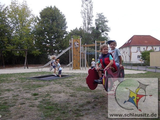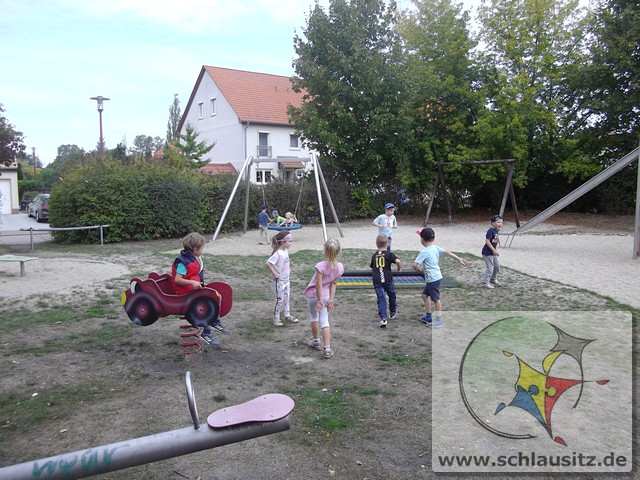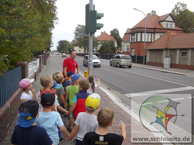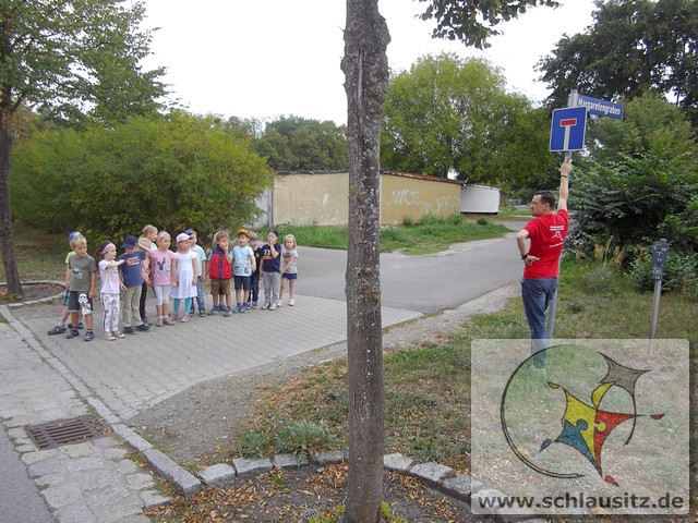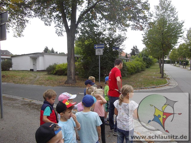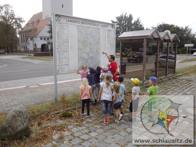 Wir wollten auf die Suche nach Verkehrsschildern gehen, doch wir entdeckten noch viel mehr… Auf dem Markt steht eine große Karte von unserem Lausitzer Seenland und auf der Straßenseite ist der Stadtplan von Brieske zu sehen. Auch eine Ampel konnten wir überqueren und erfuhren, dass das Gebäude auf der anderen Straßenseite früher eine Post gewesen ist. Weiter ging es an der Kirche und an den Garagen vorbei, und schließlich waren wir auf einem Spielplatz.