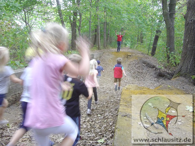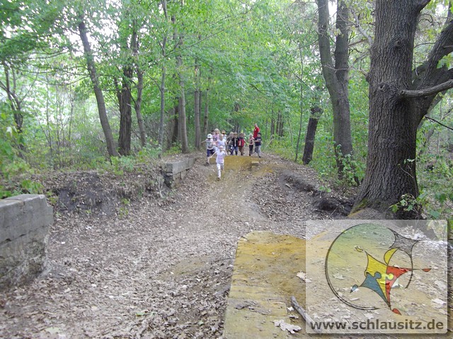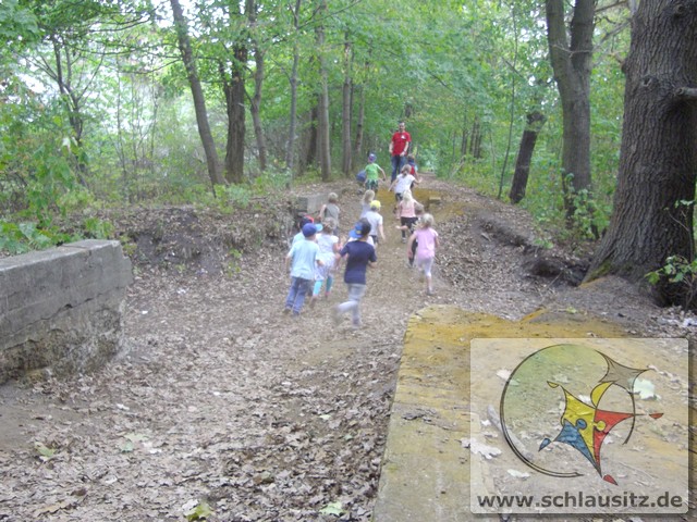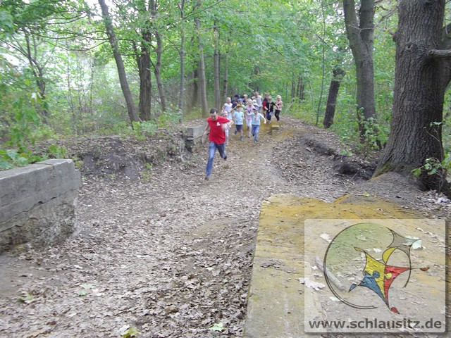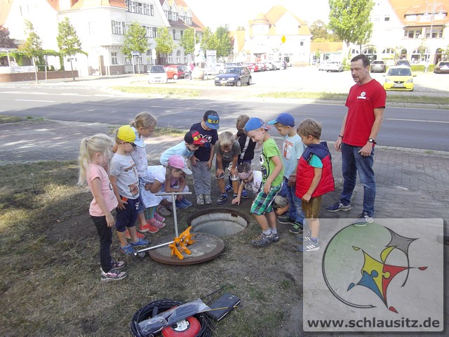 Doch das war noch nicht alles, auf dem Rückweg rannten wir durch die Schlucht des Schreckens und durften vor der Kirche in einen Schacht hinunter spähen. Dort war eine Messpumpe, die den Grundwasserspiegel misst, damit unser schönes Brieske nicht untergeht. Nebenbei automatisierten wir das Links- und Rechtsgucken beim Straßen überqueren.