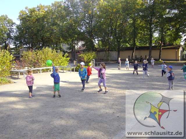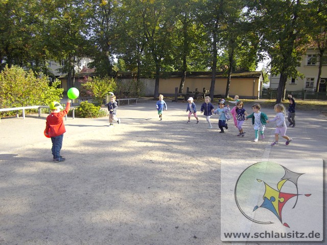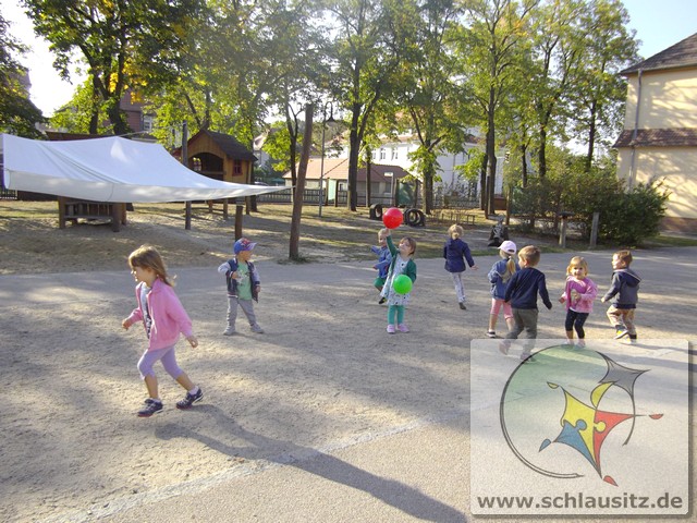 Wenn die Ampel grün zeigt (das Kind hält den grünen Ballon nach oben und ruft grün), dürfen alle anderen Kinder laufen.