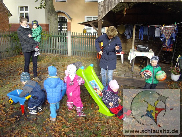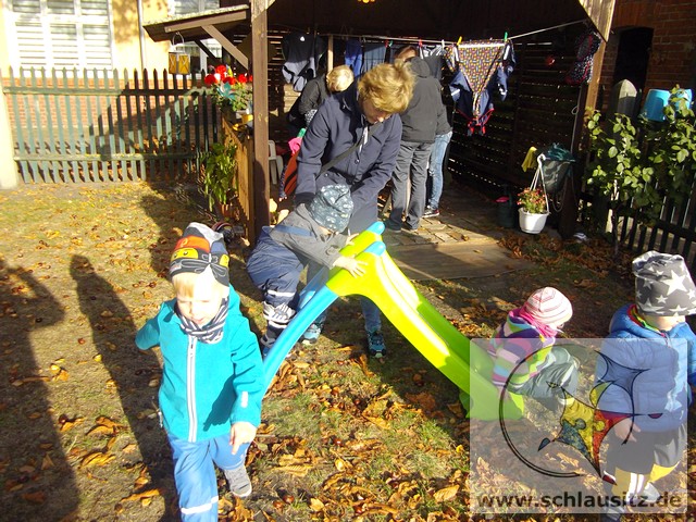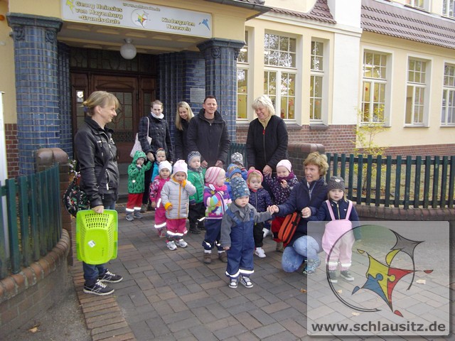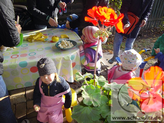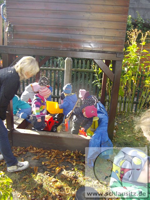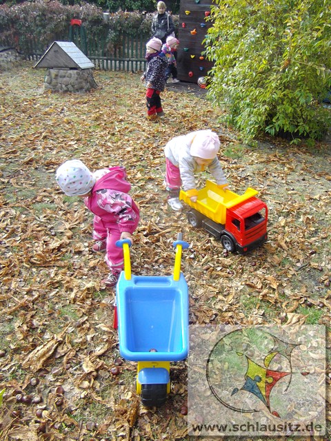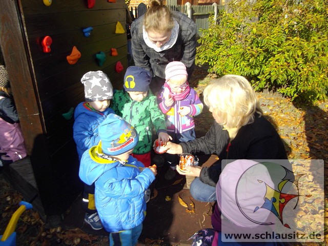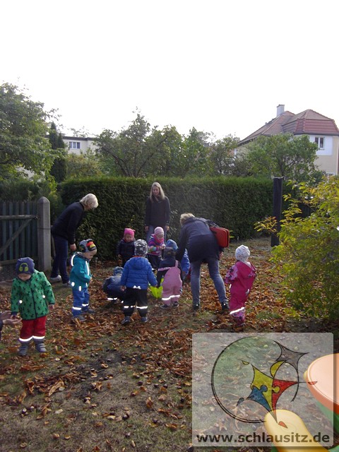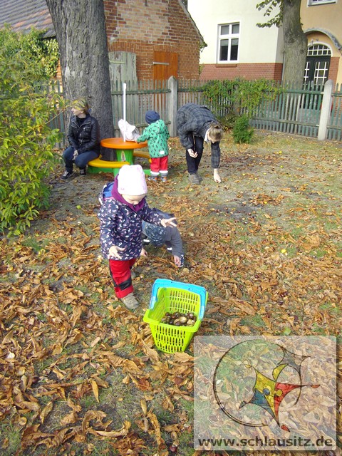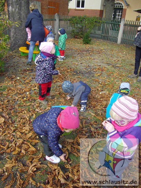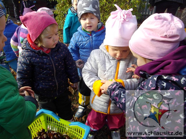 Heute war ein aufregender Tag bei den Marienkäfern! Am Morgen herrschte großer Trubel in der Garderobe, viele helfende Hände zogen Regenhosen, Schuhe, Mützen, sowie Jacken an und begleiteten uns bei unserem Ausflug. Evan`s Oma hatte uns in ihren Garten eingeladen, denn dort steht ein riesengroßer Kastanienbaum, und wir wollten viele Kastanien sammeln. Unterstützt von Mama`s, Papa`s , Oma`s und Tanten spazierten wir dorthin. Wir liefen bis zur Ampel, warteten auf das grüne Signal und schon ging es über die große Straße. Jeder Marienkäfer hielt seinen Freund gut fest und schon bald kamen wir zu Evan`s Garten. Dort lagen sooo viele Kastanien. Mit viel Eifer sammelten wir die kleinen braunen Früchte in den Korb. Viele hatten sogar noch eine Schale um und wir beschlossen zu beobachten, wie sie im warmen Gruppenraum aufbrechen und die Kastanien herauskullern. Später gab es eine leckere Obstpause und dann durften wir alle Spielgeräte im Garten erobern. Was für ein Spaß! Wir konnten rutschen, Ball spielen und im Sandkasten buddeln. Ganz viel Spielzeug war bereitgestellt und wir haben alles ausprobiert. Dann gab es sogar noch eine „süße“ Pause. Nun wurde es schon wieder Zeit für uns, gemeinsam gingen wir zurück in den Kindergarten. Evan´s Oma spendierte uns noch leckeren Joghurt, den wir gleich nach dem Mittagessen naschten.