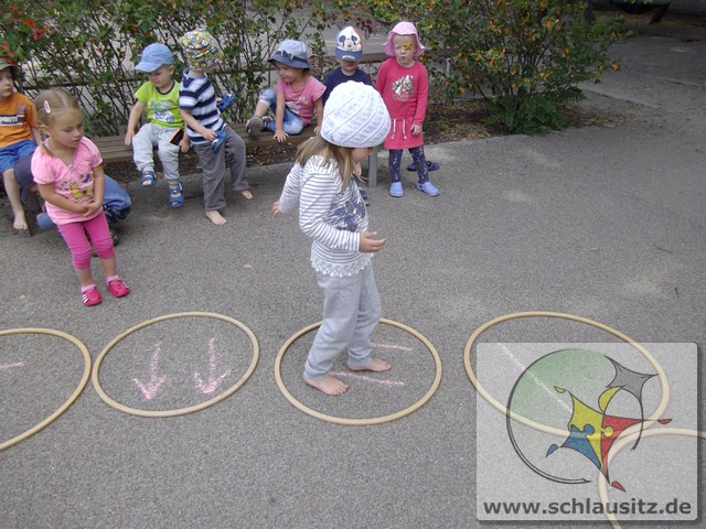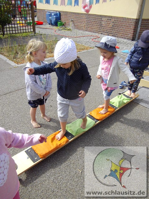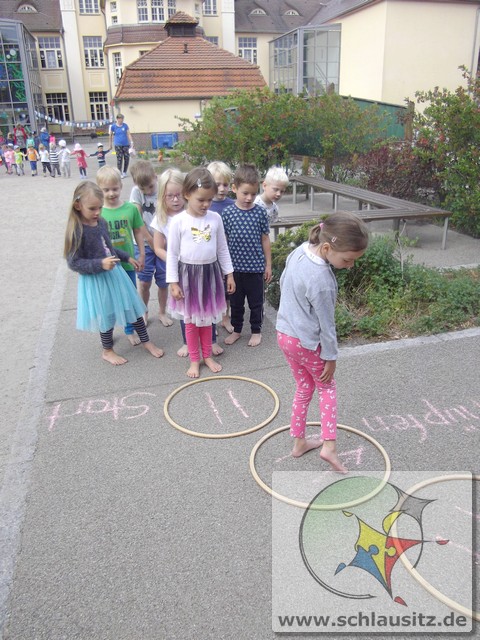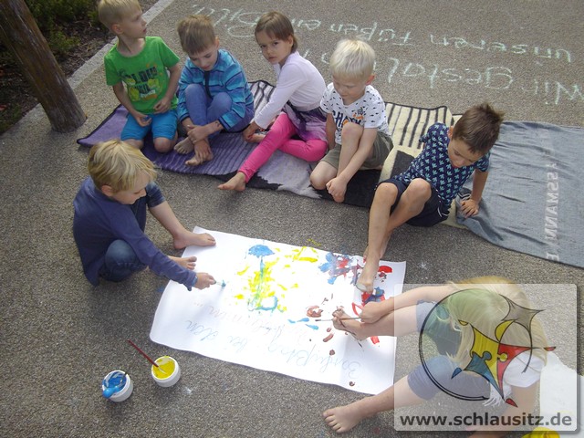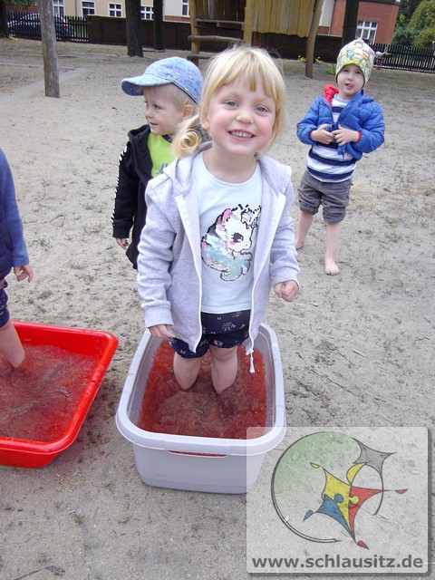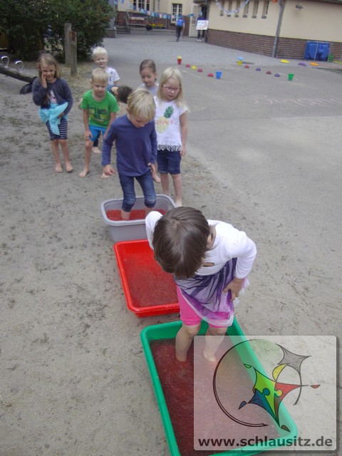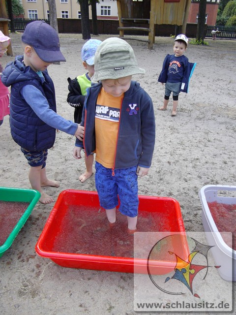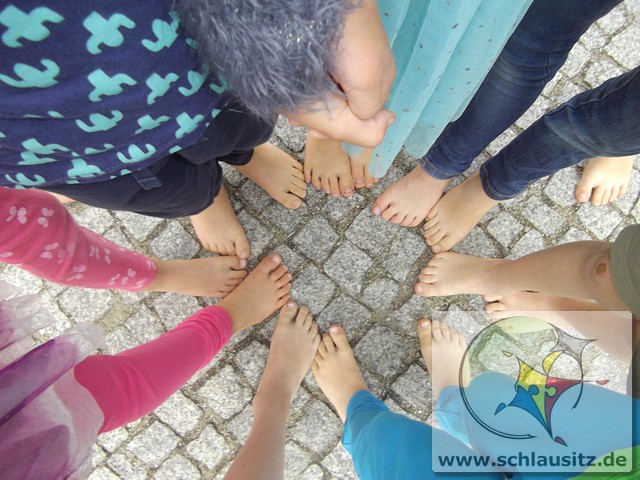 Es ging am Barfußtag darum, mit den nackten Füßen verschiedene Übungen zu absolvieren. So gab es Balancierstrecken, eine „Balancierburg“, Hüpfaufgaben, Malen und Greifen mit den Füßen und Fühl- und Matschstrecken. Dabei gab es immer wieder einmal sehr lustige Situationen, bei denen wir viel lachen konnten.