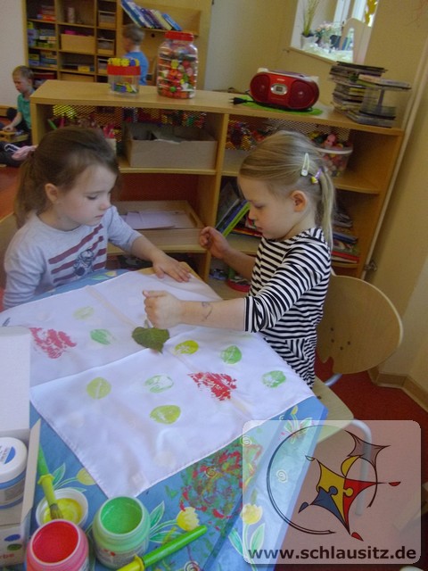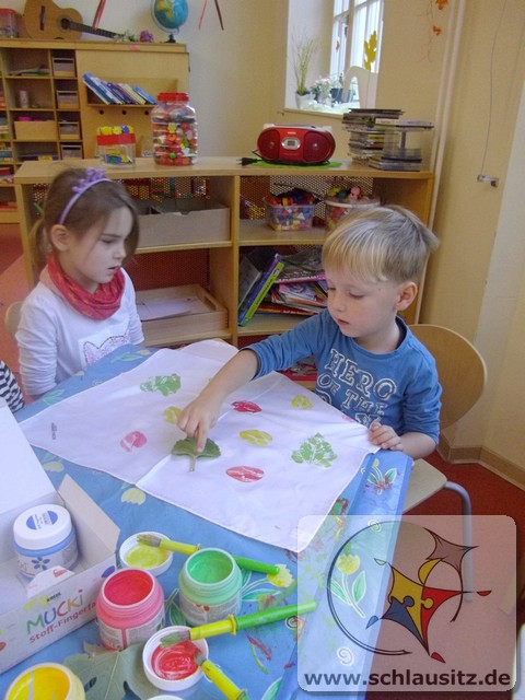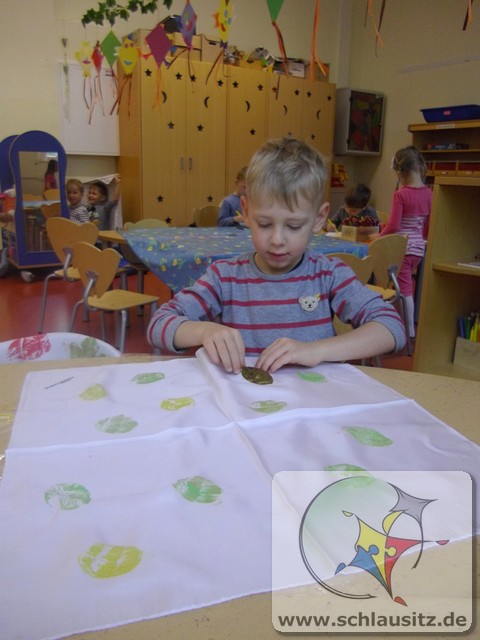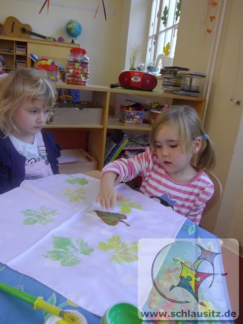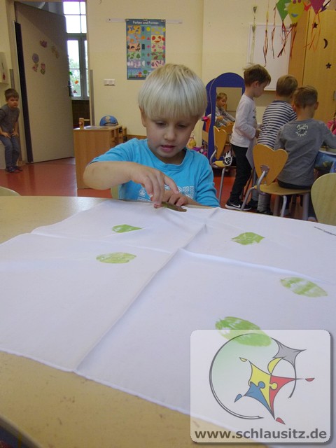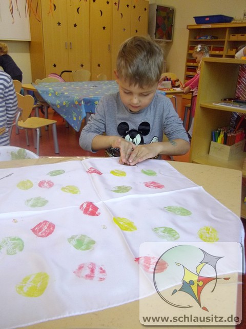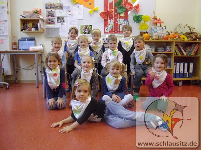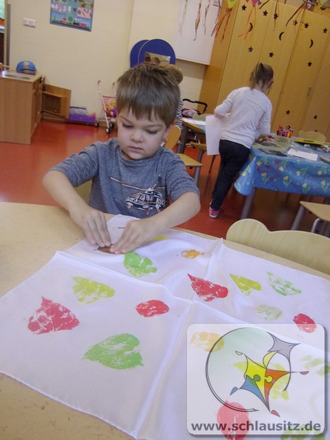 Wir Rennmäuse haben mit Stofffarben Blätter - in Herbstfarben - auf Seidentücher gedruckt. Nun hat jedes Kind sein individuelles Herbst-Halstuch.