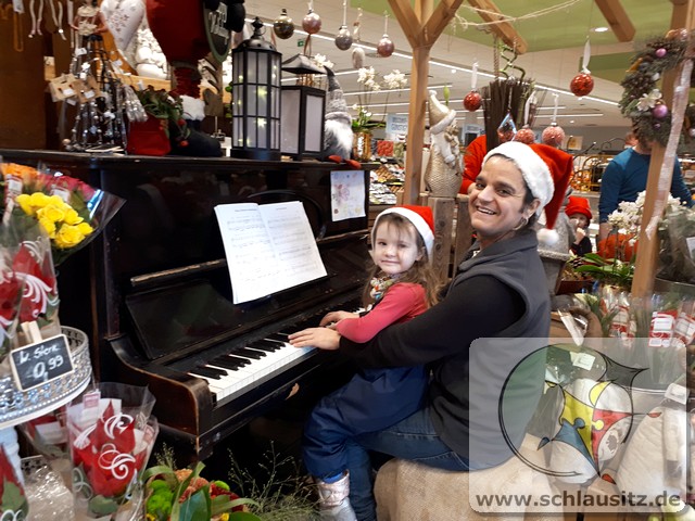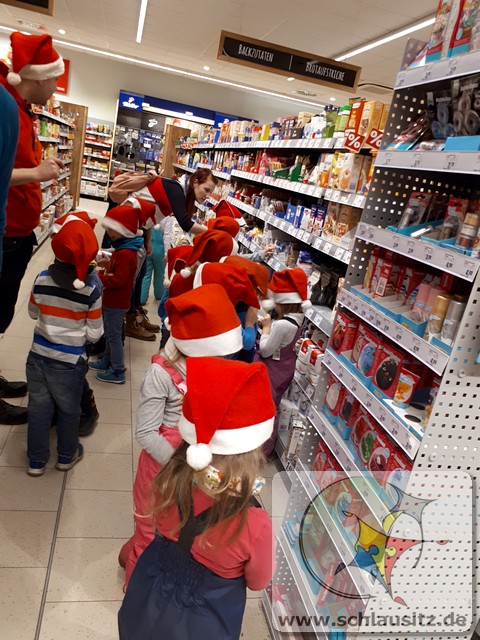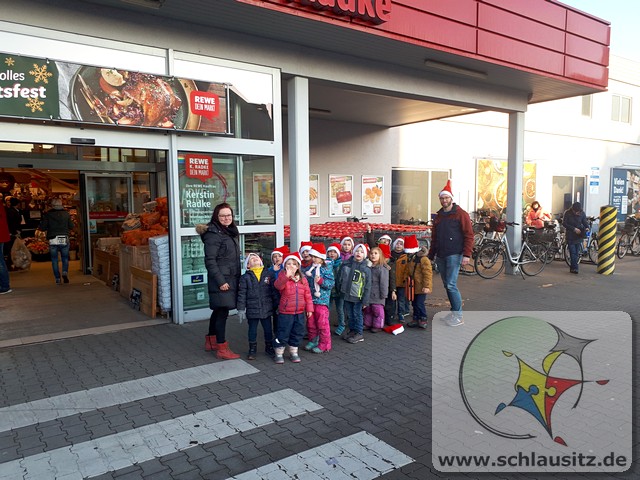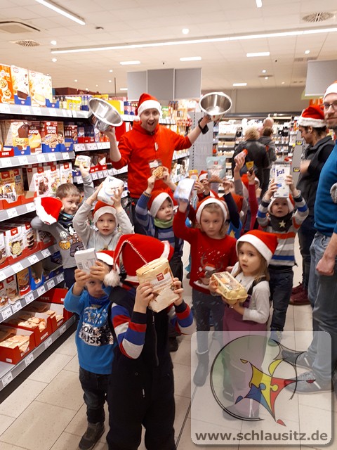 Am letzten Kindergartentag 2019 sind wir Rennmäuse mit dem Bus gefahren. Das war schon super aufregend, da es für viele Kinder die erste Fahrt mit einem Bus war. Unsere Fahrt ging zum Rewe-Markt der Familie Radke in die Bahnhofstraße. Am Rewe angekommen wurden wir schon von Jens und Hardy empfangen und begrüßt. Wir sangen gemeinsam Weihnachtslieder und Hardy begleitete uns am Klavier. Dann sind wir durch den Laden gegangen und haben alle Zutaten gesucht, die man zum Plätzchen backen benötigt. Die Zutaten kamen alle in eine große Schüssel, wir mussten einen Zauberspruch sagen und kräftig pusten. So haben wir fertige Plätzchen gezaubert, die wir naschen durften.