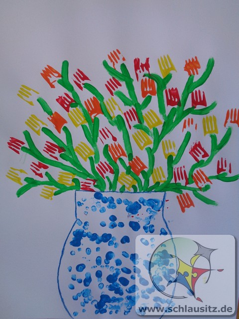 Unseren Gruppenraum wollten wir natürlich auch frühlingshaft dekorieren und gestalteten einen Tulpenstrauß auf dem Papier. Dazu benötigten wir nur verschiedene Fingerfarben und eine Gabel.