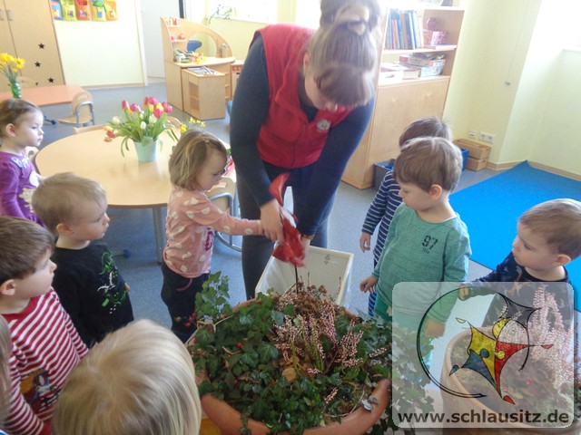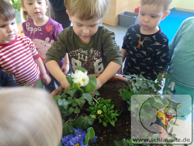 Damit es auch in unserem Kindergarten wieder schön bunt wird, beschlossen wir, unsere Frühblüher in die großen Blumenkübel vor dem Haupteingang einzupflanzen.