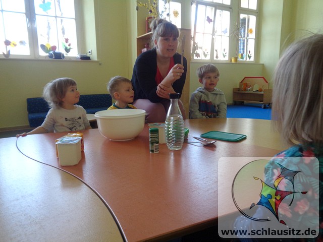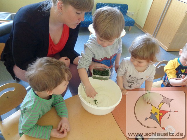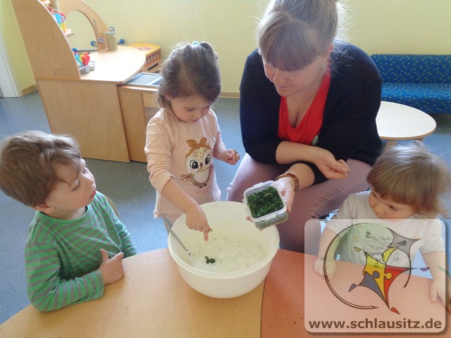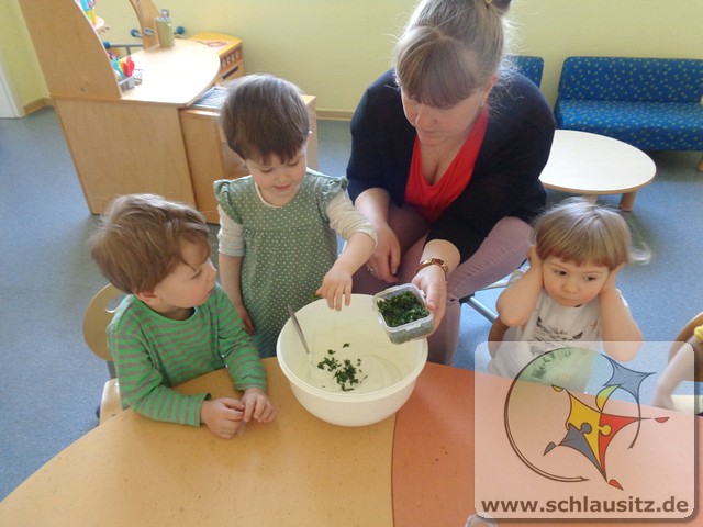Am Ende des Monats März, bereiteten wir noch einen schmackhaften Frühlingsquark zu. Die Zutaten hierfür waren: Quark, Schnittlauch, Kräuterquark und Mineralwasser.