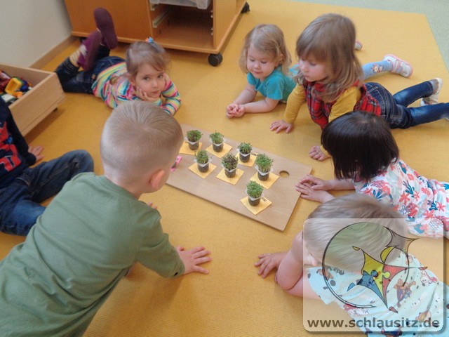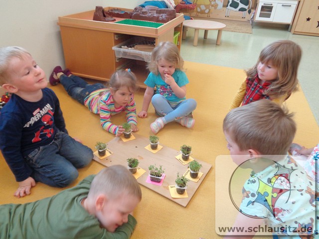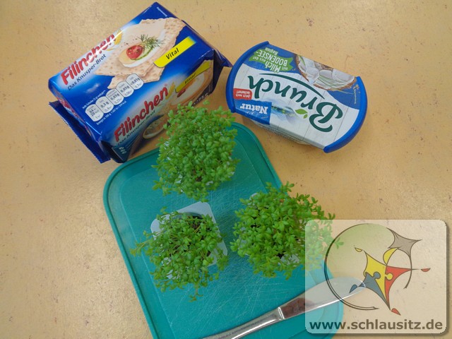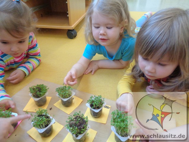 Im Morgenkreis beschäftigten wir uns mit dem Thema Kresse. Was ist Kresse? Kann man sie essen? Wie sieht sie aus? Schmeckt sie gut? Wie ist ihr Geruch? Viele, viele Fragen, die wir beantwortet haben wollten. Neugierig darauf, beschlossen wir unsere eigene Kresse zu pflanzen. Jeder bekam einen kleinen Joghurtbecher, den er bis zur Hälfte mit Erde befüllte. Danach streuten wir Kressesamen drauf und bedeckten diese wieder mit ein wenig Erde. Im Anschluss einmal schön wässern, und dann hieß es erstmal warten. Am ersten Tag betrachteten wir unsere Becher im Morgenkreis. Konnte man schon etwas erkennen? Tatsächlich, beim genaueren Hinschauen konnte man erkennen, wie die Samen zu keimen begannen. Jeden Tag im Morgenkreis konnten wir sehen, wie die Kresse über Nacht wieder ein Stück gewachsen ist. Nach 4 Tagen war es dann endlich soweit. Unsere Kresse war groß genug, um sie uns schmecken zu lassen. Auf Knäckebrot und einem Natur-Frischkäse ließen wir sie uns schmecken!