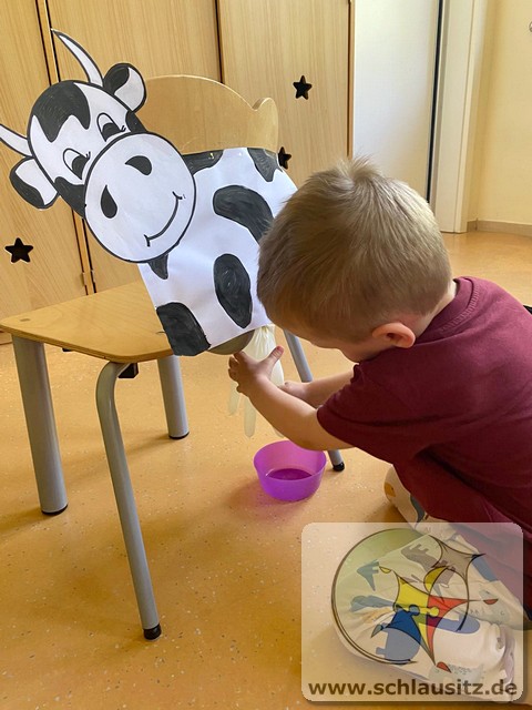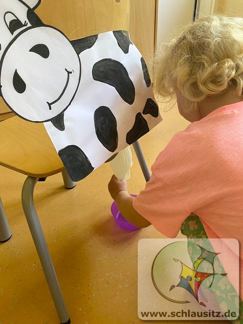 Kuh Elsa erzählte Wilma und uns wissenswertes über ihren Hof. Außerdem erfuhren wir, was der Bauer alles aus Milch herstellen kann. Da kam bei Wilma die Frage auf, wie die Milch in die Milchtüte kommt. Elsa erzählte ihr und den Igelkindern, dass die Milch aus ihrem Euter kommt und wie der Bauer dies macht. Wilma staunte und die Igelkinder waren sehr neugierig darauf, es selbst zu probieren. Dann ging es los. Elsa stand ganz still und jedes Kind dürfte einmal melken. Es war gar nicht so einfach, denn man brauchte viel Gefühl und trotzdem Kraft. Es klappte mit etwas Übung richtig super und Elsa war auf die Igelkinder sehr stolz.