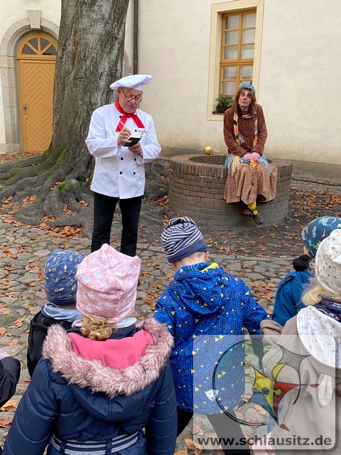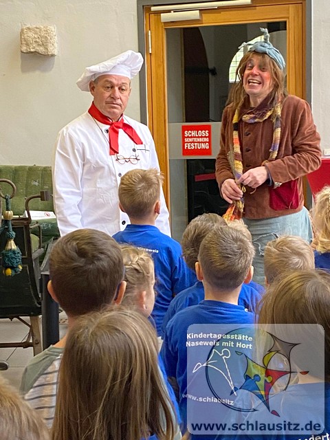 Dort erwartete uns jedoch kein Theaterstück. Denn die Hexe Henriette hatte an einem warmen Tag draußen im Schloss gelesen und dann das Märchenbuch vergessen. Alle Seiten waren verschwunden. Deshalb begaben sich der Koch Herr Suppenklein und die Hexe, gemeinsam mit den Kindern, im ganzen Schloss nach den verschwundenen Märchen auf die Suche.